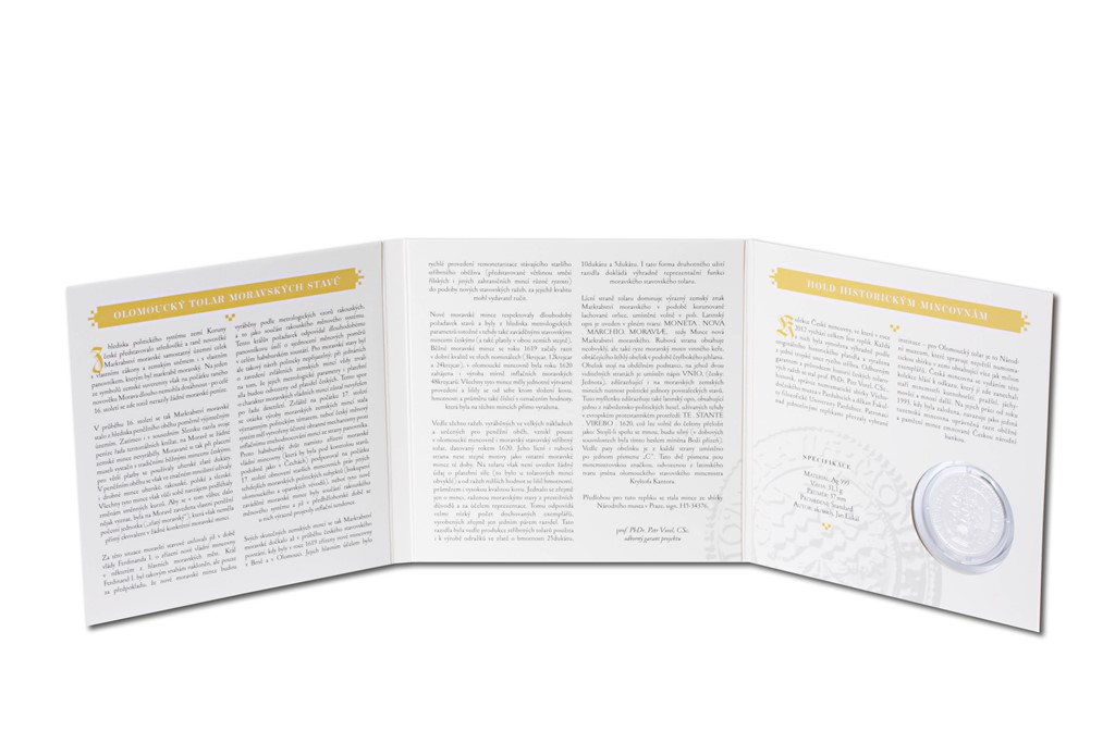 Replika tolaru z roku 1620 z olomoucké mincovny, vytvořená podle originální mince, se razí z trojské unce ryzího stříbra. Tolar moravských stavů pochází z doby českého stavovského povstání, kdy byly v roce 1619 zřízeny na Moravě nové mincovny v Brně a v Olomouci. Jejich hlavním účelem bylo rychlé provedení remonetarizace staršího stříbrného oběživa do podoby nových stavovských ražeb, za jejichž kvalitu mohl vydavatel ručit. Jedná se patrně o minci, raženou moravskými stavy z prestižních důvodů a za účelem reprezentace. Tomu odpovídá velmi nízký počet dochovaných exemplářů, vyrobených zřejmě jen jedním párem razidel.