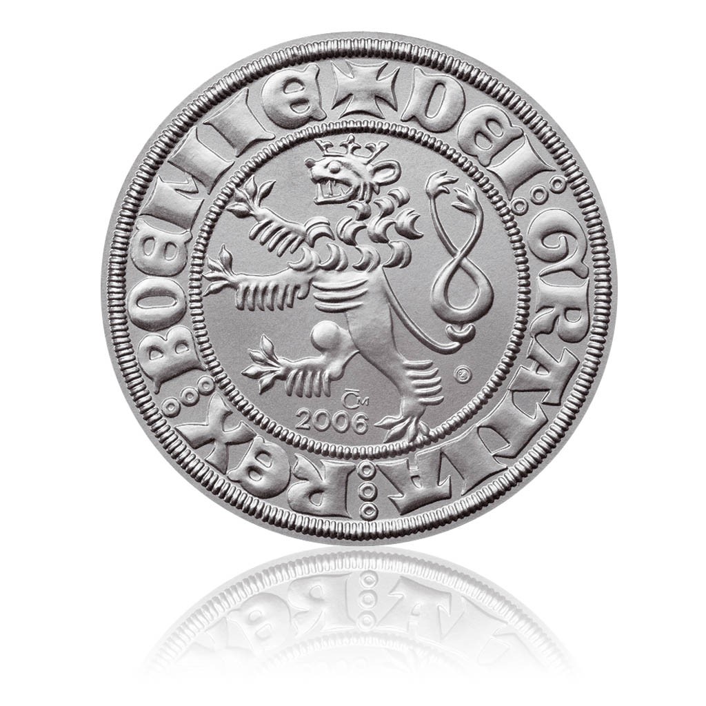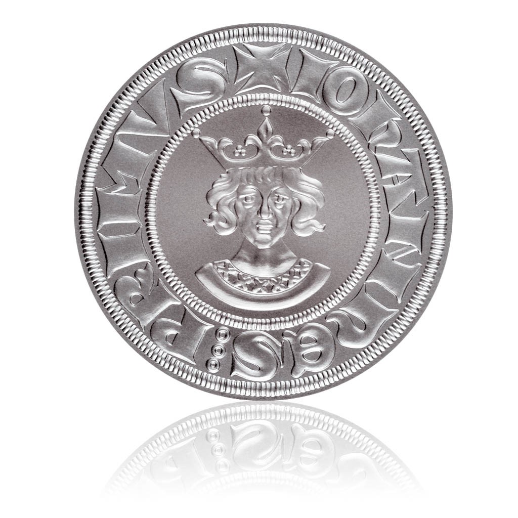 Jan I. (1310–1346) brzy po svém sňatku s Eliškou Přemyslovnou a po nástupu na trůn obnovil ražbu pražských grošů a parvů, které zavedl jeho tchán Václava II. V této době, pravděpodobně brzy po královské korunovaci, také zahájil ražbu nového nominálu – půlgroše. Tyto mince známe ve dvou typech, kdy na prvním, zvaném též anglický, je vyobrazeno na líci poprsí panovníkovo (použit pro repliku), na rozdíl od druhého, tzv. českého typu, který nese na aversu královskou korunu. Oba typy jsou velice vzácné, dochované pouze v několika exemplářích. Snad právě proto vznikly různé teorie o důvodech jejich vzniku. Různé hypotézy o nich hovoří buď jako o pouhých zkušebních ražbách, anebo o běžném, nově zavedeném nominálu, který byl ale záhy – snad pro svou nadbytečnost – stažen z oběhu. Byla také předložena teorie, že typ s korunovaným poprsím byl vyražen u příležitosti korunovace Jana I. 7. února 1311 na českého krále jako mince korunovační. Tím měl být zaveden nový nominál v rámci grošové měny, který měl dále nést, stejně jako pražský groš, na líci královskou korunu (český typ).