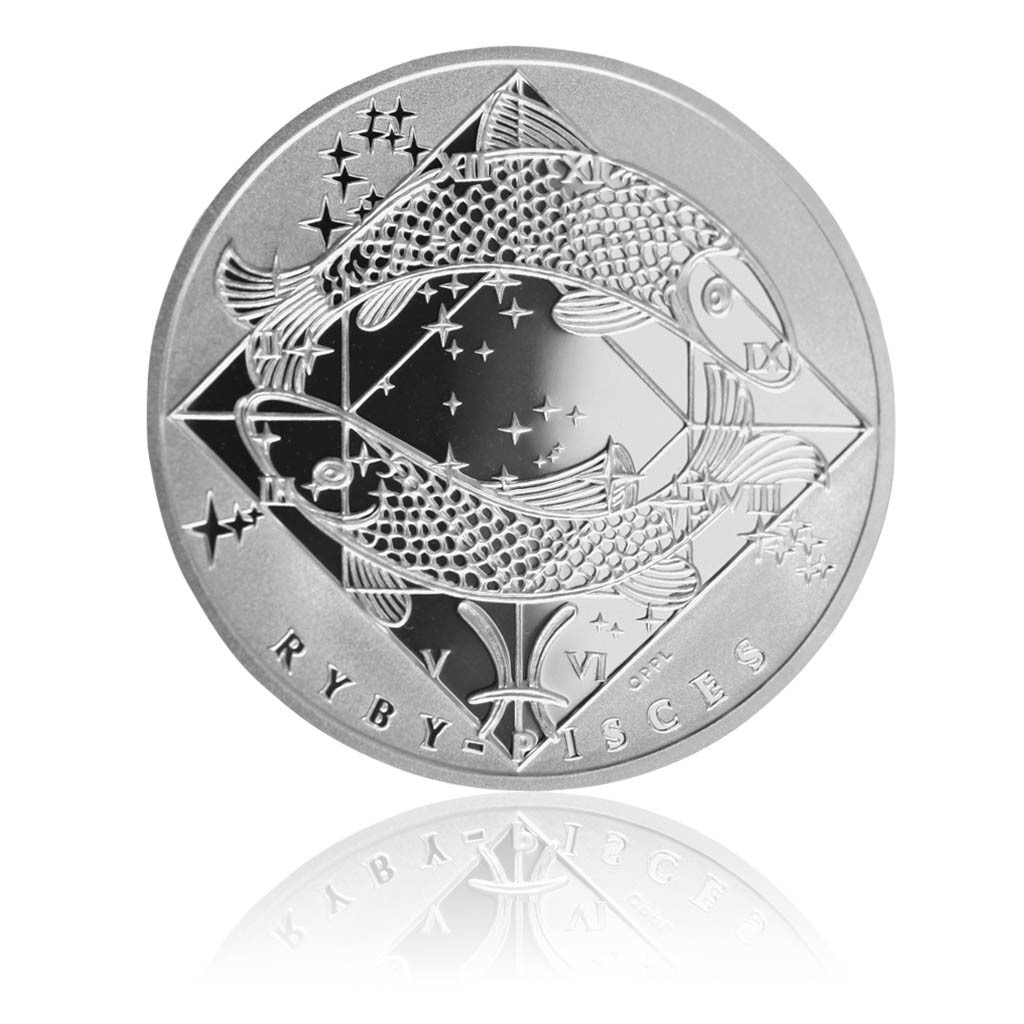 Ryby, latinsky Pisces, 21. února až 20. března. Vodní znamení s vedoucí planetou Neptun. Šťastným kovem je cín, rostlinou jasmín a dnem pátek. Společná strana všech medailí v sérii znamení zvěrokruhu nese motiv hvězdné oblohy s jednotlivými souhvězdími uspořádanými tak, jak jdou na obloze za sebou, a tudíž i v průběhu roku. Na straně s jednotlivými znameními umístěnými v leštěném kosočtverci používaném astrology je umístěno nejen znamení, ale i jeho značka, český a latinský nápis. Hvězdičky svým rozestavením odpovídají příslušnému souhvězdí na obloze.