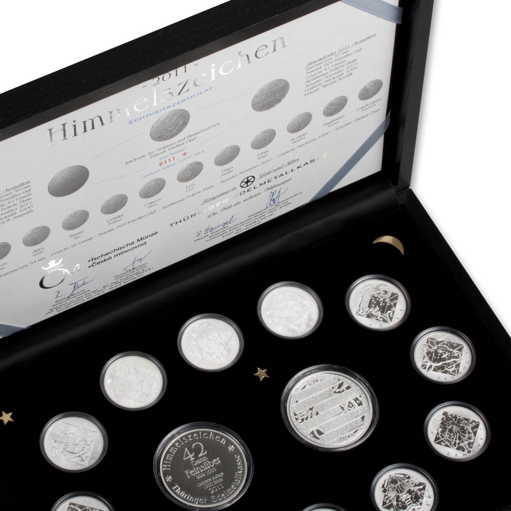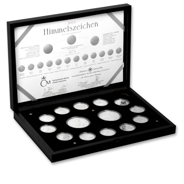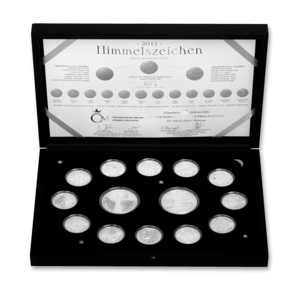 Česká mincovna společně se svým německým partnerem připravila jedinečnou dárkovou sadu sestávající z medailí, které razíme v Jablonci nad Nisou a která je určená pro distribuci v celé Evropě. Primárně se jedná o krásný a nevšední dárek, ale také investiční příležitost. Sada je v němčině pojmenovaná Himmelszeichen, což v překladu znamená znamení zvěrokruhu. Tvoří ji 12 medailí s jednotlivými znameními, které doplňují dvě medaile s kalendářem roku 2011 a vizitkou našeho partnera. Komplet je zabalený do velmi působivé etuje a všechny sady jsou opatřeny číslovaným certifikátem autentičnosti. Tato exkluzivní sada vychází v limitovaném množství 1000 ks pro celý svět.