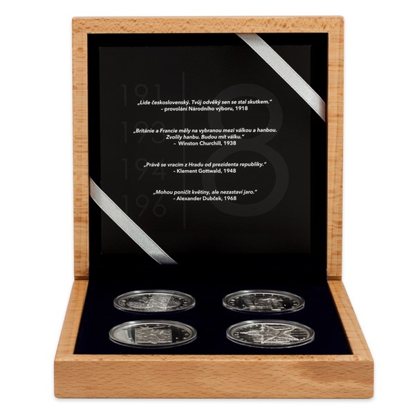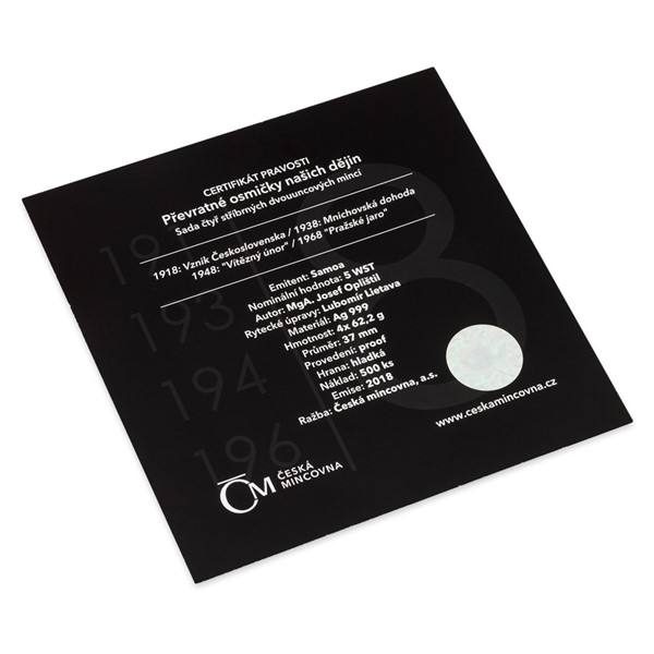 Je pozoruhodné, že ty nejdůležitější letopočty, které formovaly dějiny Československa, končí osmičkou. Pamětní sada České mincovny nazvaná „Převratné osmičky“ připomíná jejich kulatá výročí prostřednictvím čtveřice mincí. Každá mince je vyražena ze dvou trojských uncí ryzího stříbra v provedení „piedfort“. Mince s tímto označením mají oproti tradičním ražbám dvojnásobnou tloušťku – ve světě jsou velmi populární a pro Českou mincovnu se v tomto ohledu jedná o premiéru.