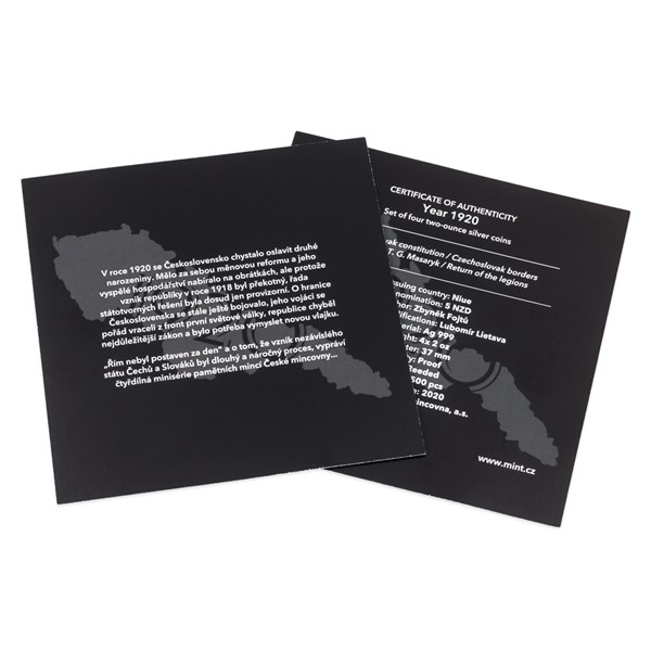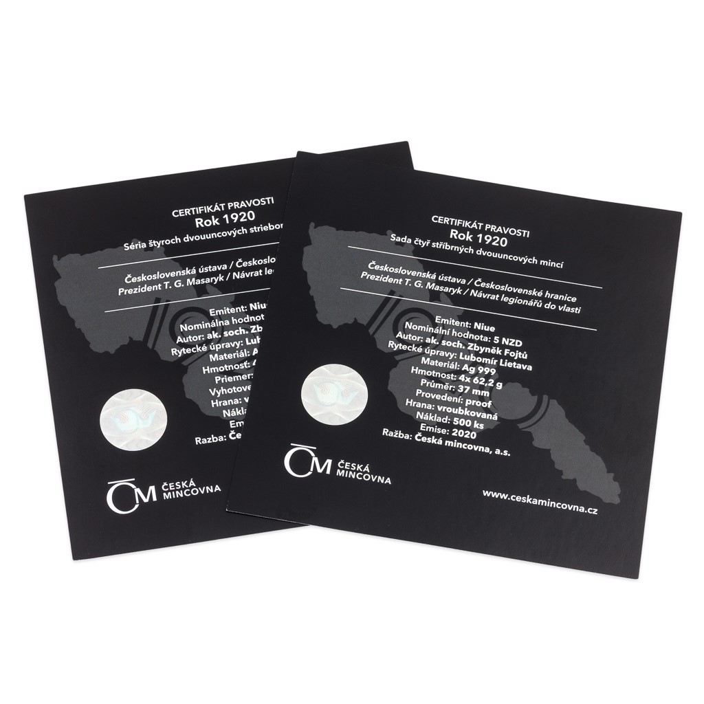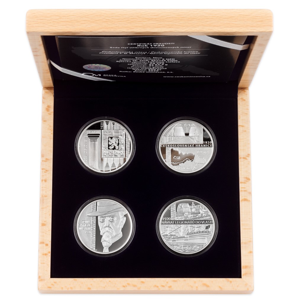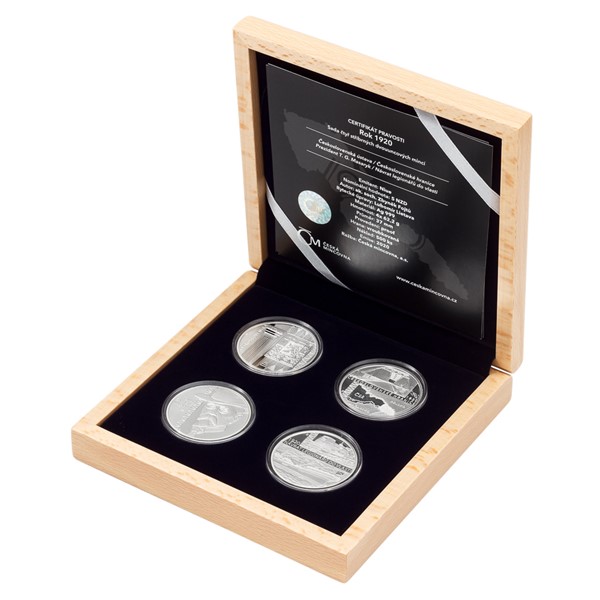 Sada čtyř pamětních mincí České mincovny s názvem Rok 1920 připomíná 100. výročí klíčových okamžiků budování československé státnosti. Každá mince je vyražena ze dvou trojských uncí ryzího stříbra v provedení piedfort – to znamená, že mince mají oproti tradičním ražbám dvojnásobnou tloušťku.