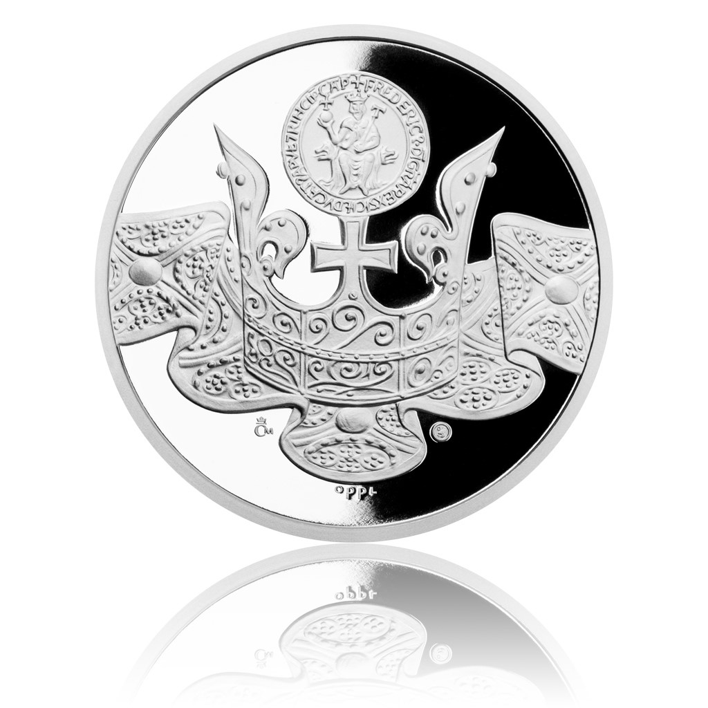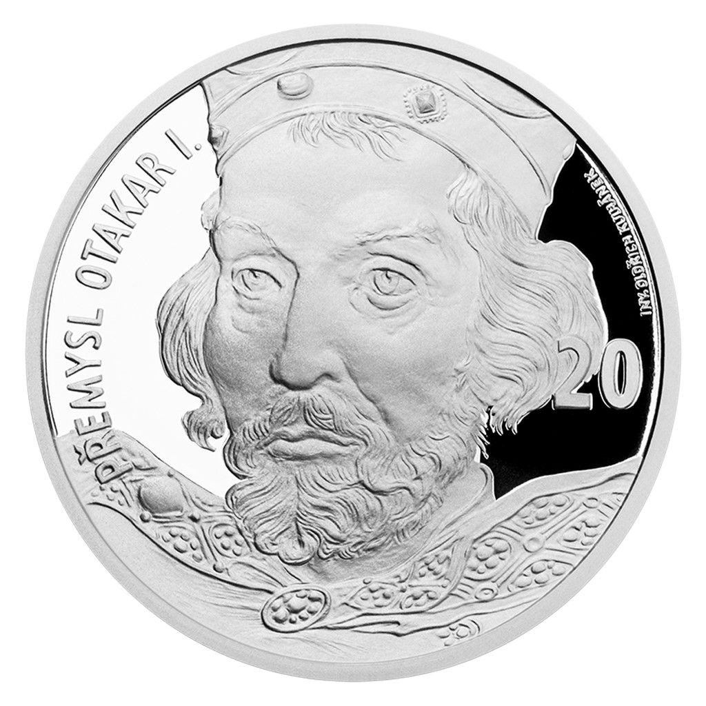 20 Kč: Averzní strana ražby patří portrétu Přemysla Otakara I., reverzní pak nese královskou korunu, dekorativní gotickou stuhu a pečeť Zlaté buly sicilské, dokumentu, který Přemyslovým potomkům zajistil dědičný nárok na titul českého krále.