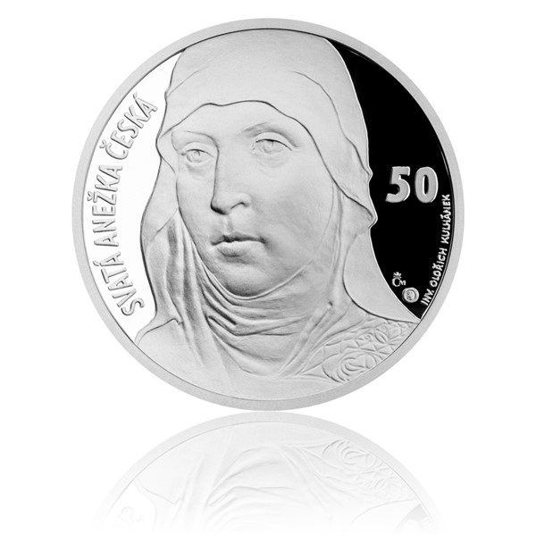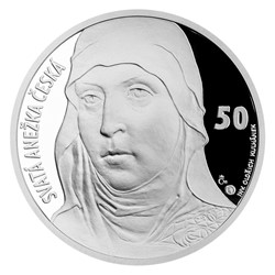 50 Kč: Averzu medaile dominuje portrét Anežky České, emancipované přemyslovské princezny, světice a české patronky. Reverz patří gotické kostelní klenbě, písmenu „A“ a postavám svatého Františka z Assisi a jeho žačky svaté Kláry, která byla Anežce vzorem.