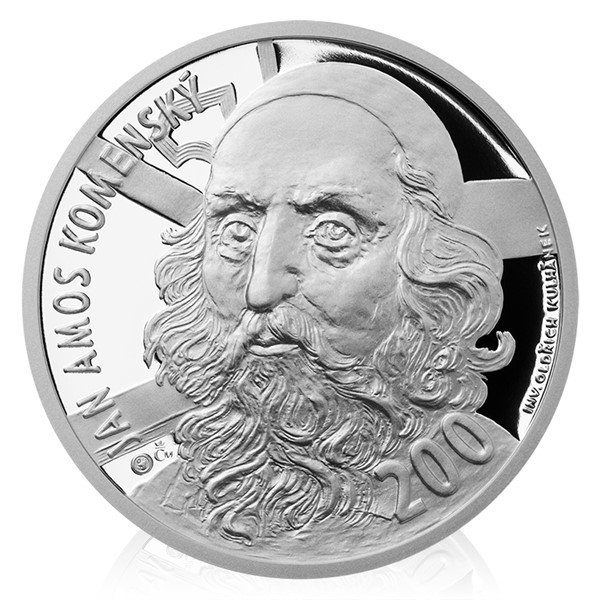 200 Kč: Averz medaile nese portrét Jana Amose Komenského, Učitele národů, reverz pak jeho přelomovou učebnici Orbis Pictus a spojené ruce dítěte a dospělého, které symbolizují výuku a předávání vědomostí.