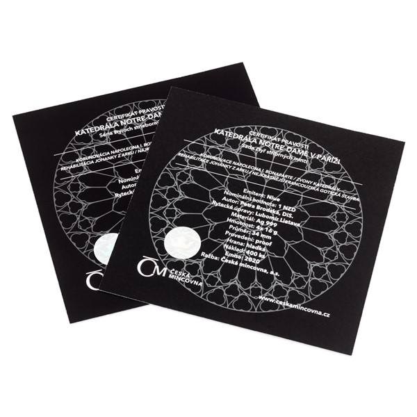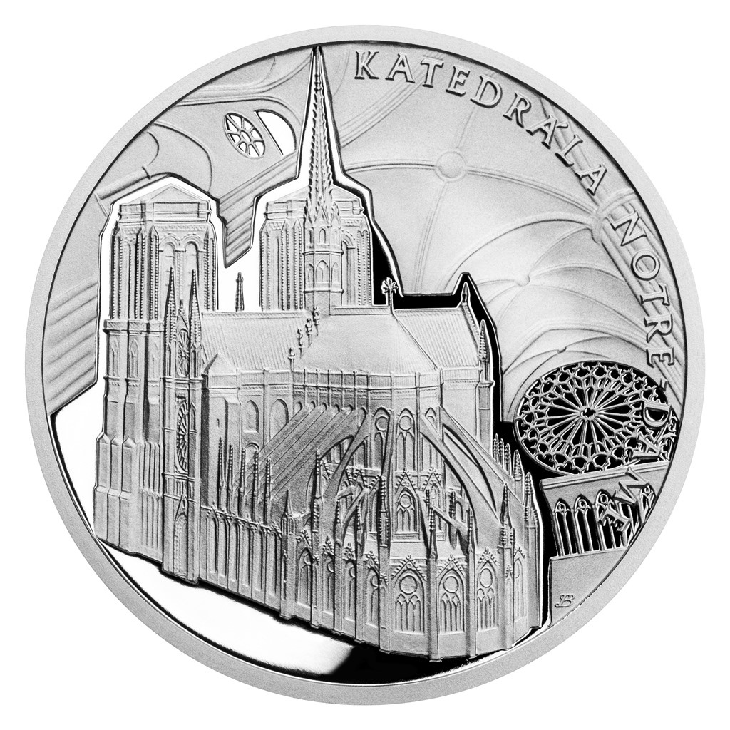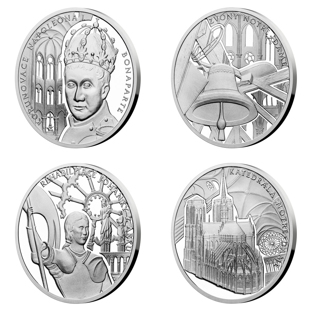 Medailérka Petra Brodská, DiS., zvěčnila na reverzních stranách stříbrných mincí nejen samotnou katedrálu, která je nejkrásnější francouzskou gotickou stavbou, ale také její proslulé zvony, v jejichž melodii nacházel útěchu zvoník Quasimodo. Další mince jsou věnovány významným osobnostem spojeným s pařížským chrámem. První je Napoleon Bonaparte – obdivovaný vojevůdce, který byl v katedrále korunován francouzským císařem. Druhou je Johanka z Arku – Panna orleánská, která byla v katedrále rehabilitována a blahořečena. Protože se jedná o mince vydávané v zahraniční licenci ostrova Niue, nese jejich společná averzní strana nezbytné náležitosti tohoto zahraničního vydavatele – státní znak, nominální hodnotu 1 DOLLAR (NZD) a letopočet emise 2020 – zakomponované do lomeného oblouku katedrály.