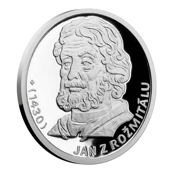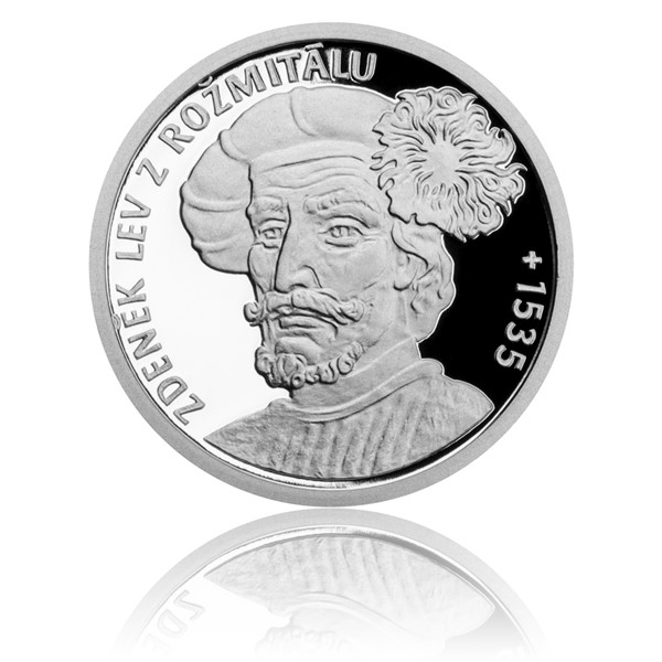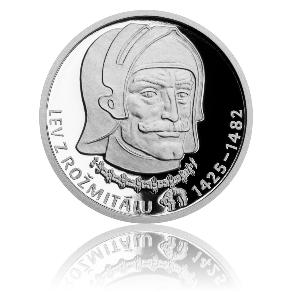 LEV Z ROŽMITÁLU (1425–1482) byl charakteristickým pozdně středověkým rytířem – reverzní strana mince ho vyobrazuje v přilbici se zdviženým hledím. Aktivně se účastnil turnajů, kde leckdy bojoval i bez brnění, byl majetný a společensky i diplomaticky obratný. Stal se proto vůdcem výpravy Jiřího z Poděbrad – krále a manžela své sestry – do západní Evropy, kde jako vůbec první Čech získal Řád zlatého rouna, který na minci zdobí jeho krk.