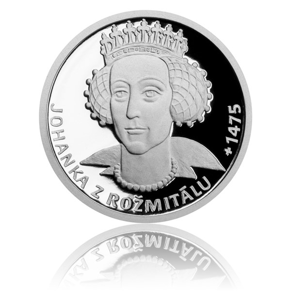 JOHANKA Z ROŽMITÁLU (zemřela 1475) se stala druhou ženou krále Jiřího z Poděbrad – na reverzu mince má proto na hlavě královskou korunku. Nebyla jen krásná a energická – v těžkých časech se stala spolehlivou oporou svému manželovi i celému království. Neváhala například osobně svolat zemskou hotovost a vytáhnout v jejím čele proti nepříteli ohrožujícímu zemi.