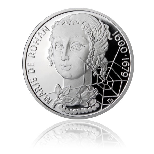 Marie de Rohan, 1600–1679, portrét je doplněn růží a pavučinou, jež symbolizují její krásu, ale také zákulisní politiku.