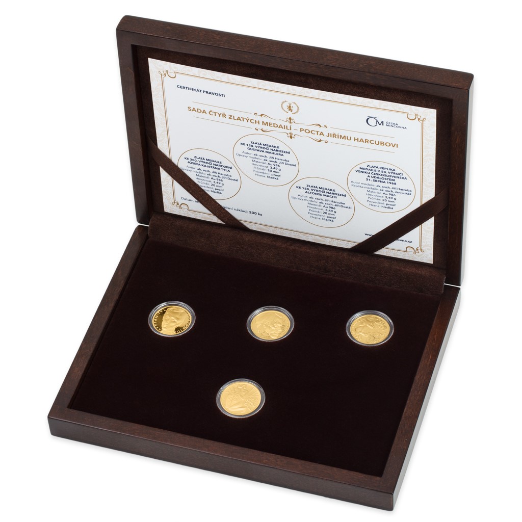 Sada obsahuje tři portrétní medaile – Gustav Mahler, Alfons Mucha a Josef Kajetán Tyl. Jejich averzy zdobí originální vyobrazení těchto význačných umělců, reverzní strana je pak všem společná a nese motiv Múzy. Čtvrtá medaile v sadě je replikou originálu, který vznikl při příležitosti 50. výročí zrodu samostatného Československa a zachytil také události 21. srpna 1968. Odvážná kompozice dokonce přivedla Harcubu do vězení. Sadu čtyř přepychových zlatých medailí získáte v dřevěné etuji s tematickým gravírováním, vzpomínkovou publikací a certifikátem pravosti. Vyhraďte této mimořádné poctě čestné místo ve svých sbírkách – sada se dostane na pouhých 200 numismatiků!