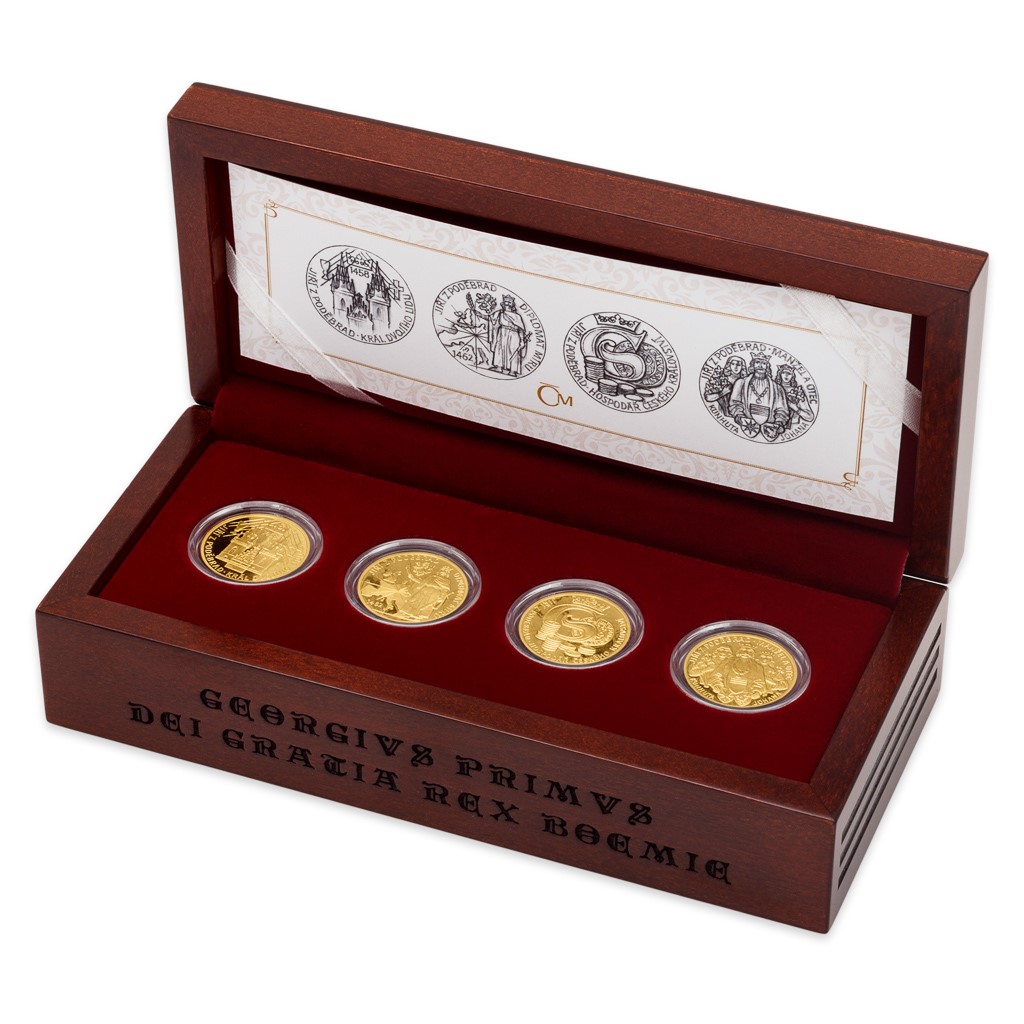 V roce 2018 uplynulo 560 let od zvolení Jiřího z Poděbrad českým králem. Jako vzpomínka na posledního skutečně českého panovníka postupně vyšly čtyři zlaté mince České mincovny, které ho představily v několika úlohách. Nyní všechny tyto ražby – s větší hmotností a průměrem – vydáváme jako ucelenou sadu nazvanou Doba Jiřího z Poděbrad.