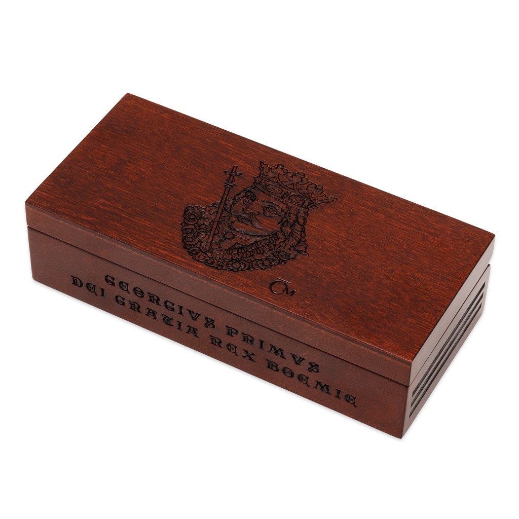 Sada mincí vychází v nákladu pouhých 100 kusů a je uložena do zdobené dřevěné etue. Na víčku najdete portrét Jiřího z Poděbrad inspirovaný Kuthenovou kronikou. Latinský nápis na čelní straně vychází z dobového groše a zní „Jiří z Poděbrad, z boží milosti král český“. Tři pruhy na bočnicích pak odkazují na erb rodu pánů z Kunštátu a Poděbrad. Certifikát pravosti je ozdoben původními kresbami Michala Vitanovského.