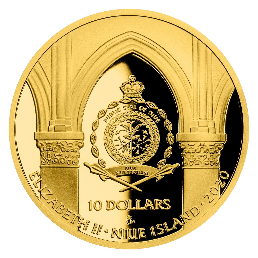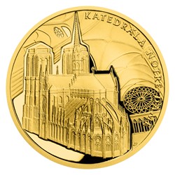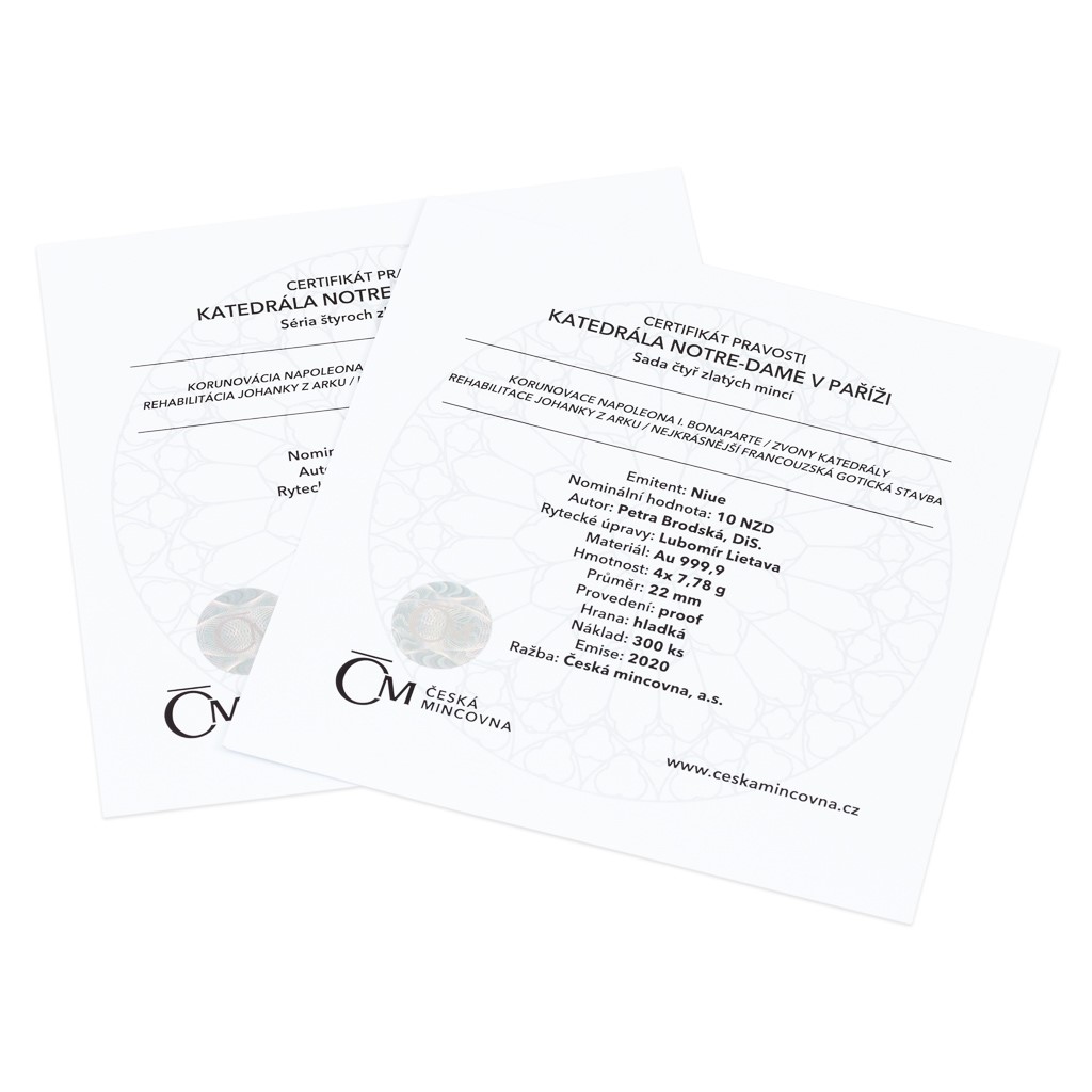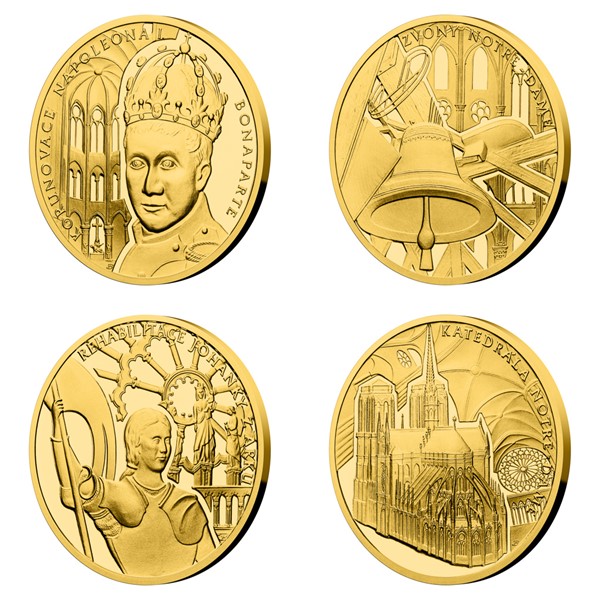 Na reverzních stranách zlatých mincí se v podání medailérky Petry Brodské, DiS., představuje nejen samotná katedrála, která je nejkrásnější francouzskou gotickou stavbou, ale také její proslulé zvony, které oznamovaly řadu stěžejních historických událostí a v jejichž melodii nacházel útěchu zvoník Quasimodo. Další mince jsou věnovány významným osobnostem spojeným s pařížským chrámem. První je Napoleon Bonaparte, druhou Johanka z Arku – Panna orleánská, která byla v katedrále rehabilitována a blahořečena. Protože se jedná o mince vydávané v zahraniční licenci ostrova Niue, nese jejich společná averzní strana nezbytné atributy tohoto zahraničního vydavatele – státní znak, nominální hodnotu 10 DOLLARS (NZD) a letopočet emise 2020 – zakomponované do lomeného oblouku katedrály.