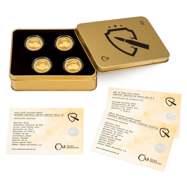 Sada čtyř zlatých mincí Obrněná technika 2. světové války II. proof