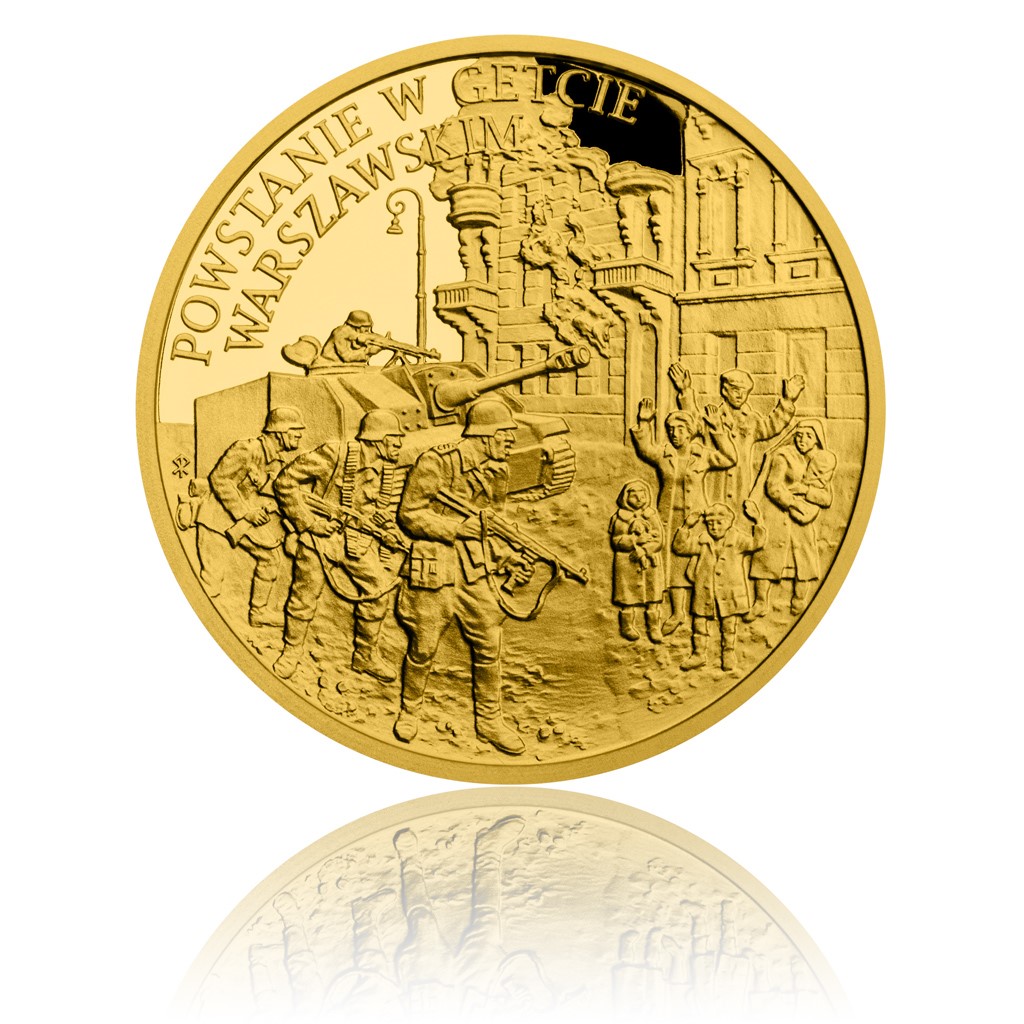 - Druhá mince vzdává hold hrdinům a obětem tragického povstání ve varšavském ghettu. Největší akce židovského odporu v okupované Evropě se stala symbolem hrdosti, odvahy a odhodlání postavit se nesrovnatelně silnějšímu protivníkovi.
