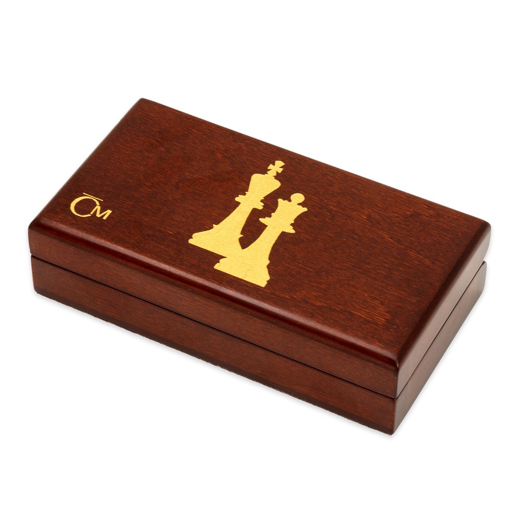 Součástí dvojice dukátů je elegantní dřevěná krabička, jejíž víčko zdobí šachové figurky symbolizující krále a královnu. V balení najdete také ilustrovaný certifikát pravosti s průvodním slovem autora.