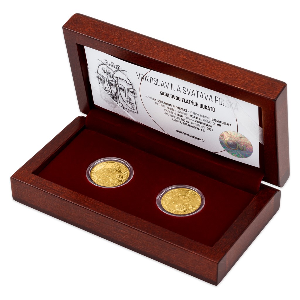 Čtvrtá sada dvou zlatých dukátů z cyklu České mincovny Královské dvojice, který vzdává hold významným historickým párům, je věnována Vratislavu II. a Svatavě Polské.