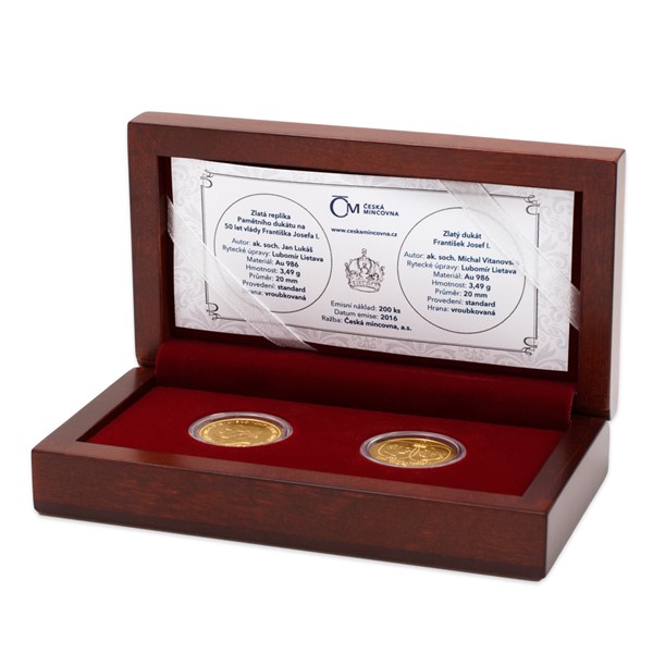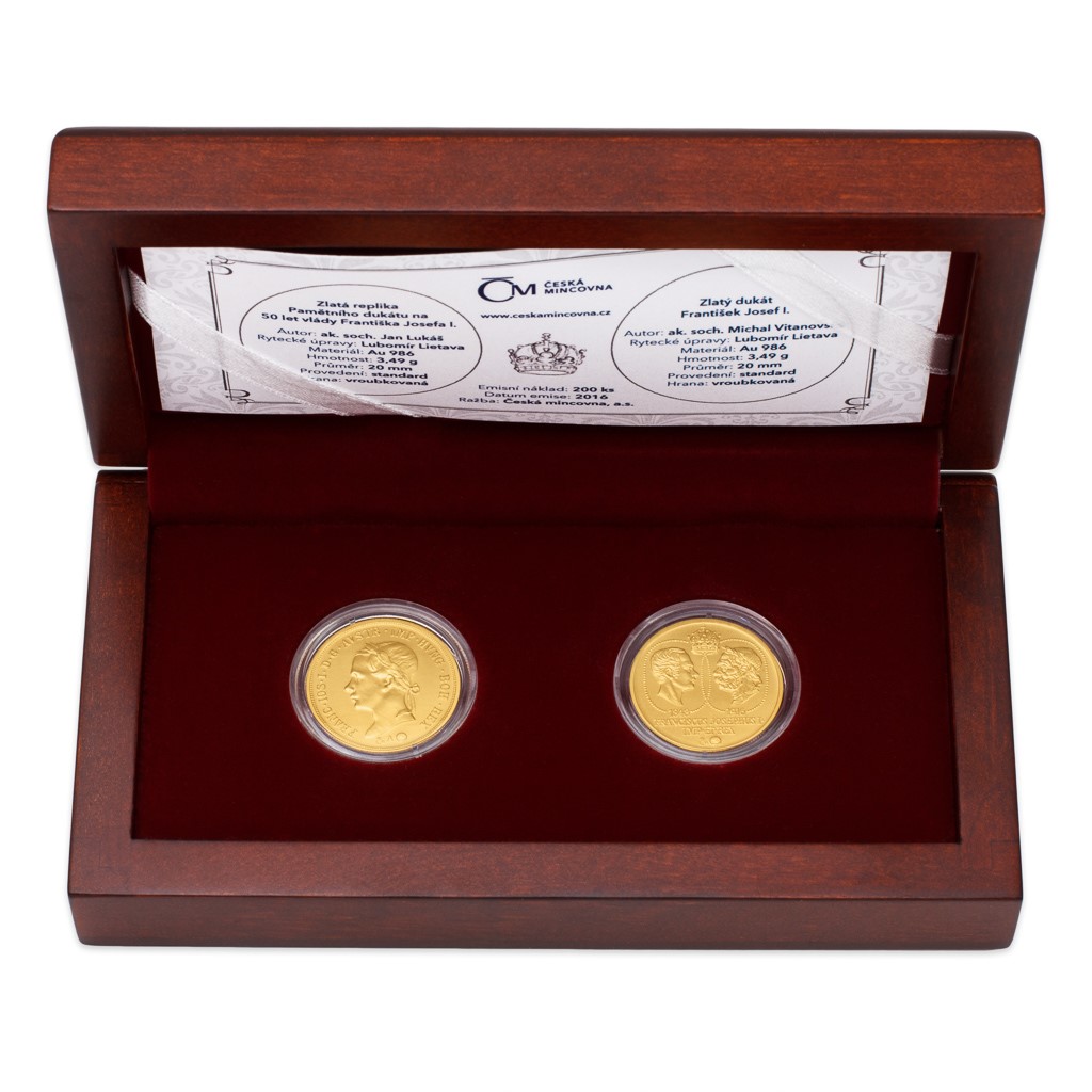 Přestože se většina Čechů otočila k rakouské části naší historie zády, Česká mincovna chtěla toto významné jubileum uctít důstojným způsobem a v duchu panovníkova hesla „VIRIBUS UNITIS“ – společnými silami. S výběrem motivů, které se na dvou ražbách objevily, proto pomohli členové České numismatické společnosti. Každá sada obsahuje repliku dobového dukátu vydaného u příležitosti 50 let vlády rakouského mocnáře, již zpracoval odborník na slovo vzatý ak. soch. Jan Lukáš, a pamětní medaili, která pochází z dílny předního medailéra a znalce historických témat ak. soch. Michala Vitanovského.