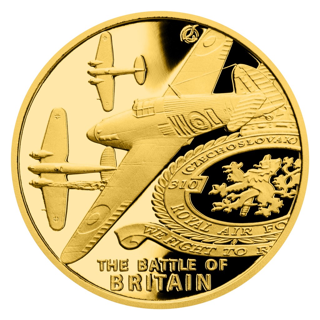 Reverzní straně mince České mincovny, která je dílem medailéra Luboše Charváta, vévodí stíhací letoun Hurricane s československou imatrikulací, který útočí na nacistické bombardéry Heinkel. Britskou půdu pod nimi symbolizuje perspektivně vyobrazený znak 310. perutě RAF. Protože licenci k vydávání pamětních mincí České mincovny poskytuje tichomořský ostrov Niue, nese averzní strana jeho nezbytné atributy – jméno a portrét královny Alžběty II., nominální hodnotu 10 DOLLARS (NZD) a rok emise 2020.