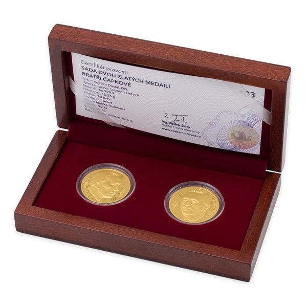 K nejvýraznějším postavám československého kulturního života mezi světovými válkami patří bezesporu bratři Čapkové. Jejich tvůrčí shoda dala vzniknout řadě pozoruhodných literárních děl, která pro svou čtivost patří i v současnosti k nesmírně oblíbeným. Ryzost osobností obou autorů nyní vyzdvihla také Česká mincovna – mimořádná sada dvou zlatých půluncových medailí je krásnou poctou oběma umělcům k jejich letošním výročím.