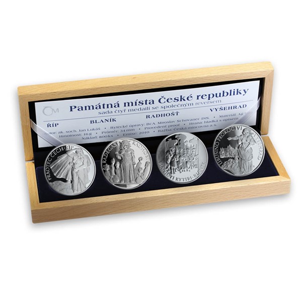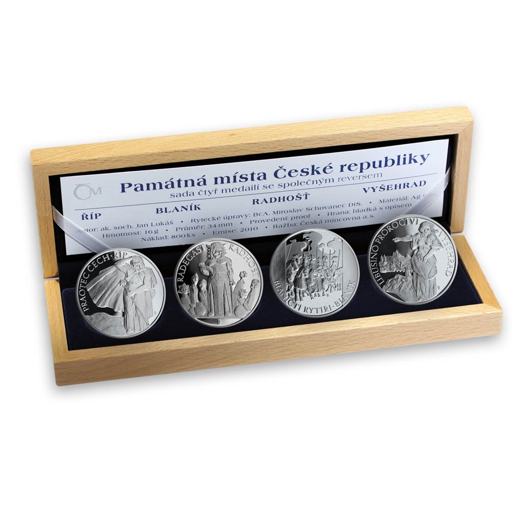 Ztvárnění stříbrné sady památných míst se ujal výtvarník Jan Lukáš. Inspirace k motivům na averzních stranách vycházejí z ilustrací Mikoláše Alše ke Starým pověstem českým od Aloise Jiráska. Říp – Postava praotce Čecha vzhlížejícího k hoře Říp, s textem „Praotec Čech – Říp“. Blaník – Vojsko Blanických rytířů, na pozadí svatováclavské orlice je umístěno v bájné skále hory Blaník, text „Blaničtí rytíři – Blaník“. Radhošť – Socha boha Radegasta, která stojí na Radhošti, je doplněna po stranách pohanskými bůžky. Text „Radegast – Radhošť“. Vyšehrad – Kněžna Libuše z Vyšehradu prorokuje velikost a slávu města Prahy. Text: „Libušino proroctví – Vyšehrad“. Limitovaná emise 800 kusů.