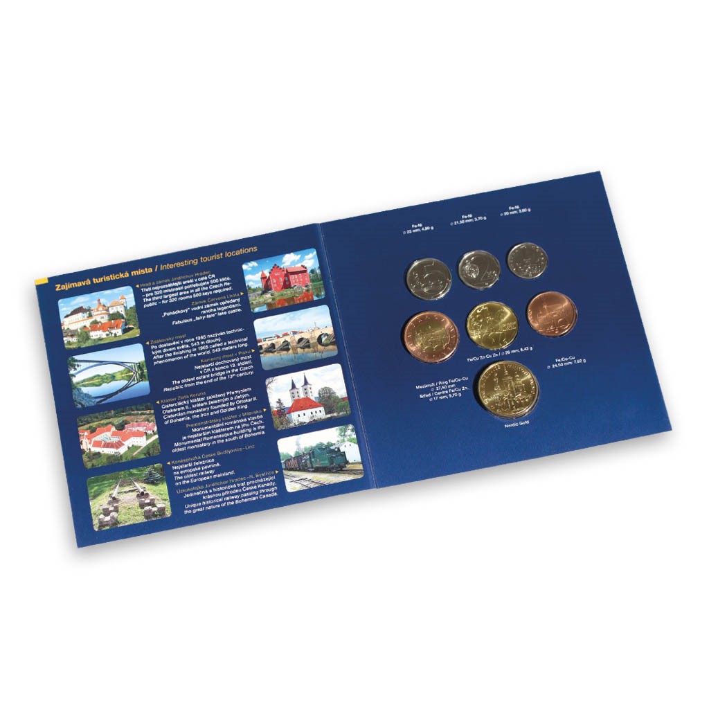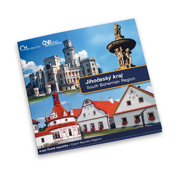 Česká mincovna ve spolupráci s Českou národní bankou započala v roce 2009 nový cyklus sad standardních oběžných mincí České republiky, která každým dalším rokem bude prezentovat některý ze třinácti českých krajů. Ročníková sada oběžných mincí je kompletována ze standardních českých mincí, které neprošly oběhem a platných v daném roce. Mince v nominálních hodnotách 1, 2, 5, 10, 20 a 50 Kč jsou uloženy v kartonových zdobených přebalech a doplněny žetonem z materiálu Nordic Gold (slitina CuAl5Zn5Sn1), který je tematicky věnován dvěma mincovním městům tohoto kraje. Averzní strana znázorňuje dominanty krajského města s opisem „České Budějovice – mincovní město“. Averzní strana nabízí pohled na dominanty Českého Krumlova, památky UNESCO a po Praze nejnavštěvovanějšího českého města, které je zároveň i městem mincovním. Autorem žetonu je ak. soch. Vladimír Oppl. Zdobený a lakovaný kartonový přebal obsahuje fotografie a texty k pamětihodným místům Jihočeského kraje. Jihočeský kraj tvoří budějovická a třeboňská kotlina, jeho hranice obklopují pohoří a vrchoviny. Je také vnímán jako „kraj rybníků“ a chovu kaprů. Jihočeský kraj je rovněž lokalitou vyhledávanou rybáři a vodáky. Vděčí za to především řekám Lužnici, Nežárce a Vltavě a vodní nádrži Lipno. Jihozápadní hranici kraje tvoří pohoří Šumava, kde najdeme řadu míst s nedotčenou přírodou. Zvláštností kraje je jeho vesnická lidová architektura, ale najdeme zde i celou řadu vzácných architektonických památek. Na seznamu UNESCO jsou zapsány Český Krumlov a Holašovice. Mezi další často vyhledávané turistické cíle lze zařadit i zámek Hluboká a města Rožmberk a Jindřichův Hradec. Limitovaná emise 10 000 kusů.
