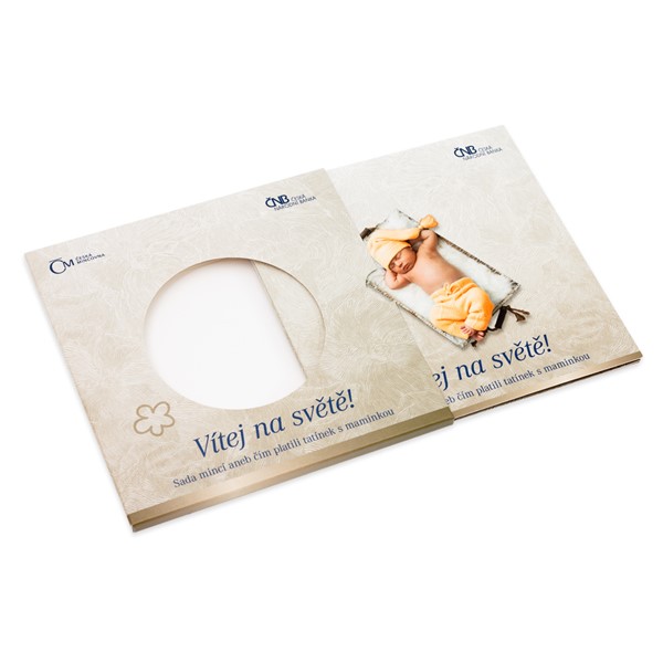 Sada oběžných mincí 2016 Narození dítěte je na přední straně dárkového obalu zdobena kromě roztomilé fotografie rovněž nápisy Vítej na světě a Sada mincí aneb čím platili tatínek s maminkou. Věnujte miminku hodnotný a originální dárek, který se možná v budoucnu stane podnětem k založení numismatické sbírky a přivede tak dítě ke koníčku, který ho bude těšit po celý jeho dlouhý a krásný život.