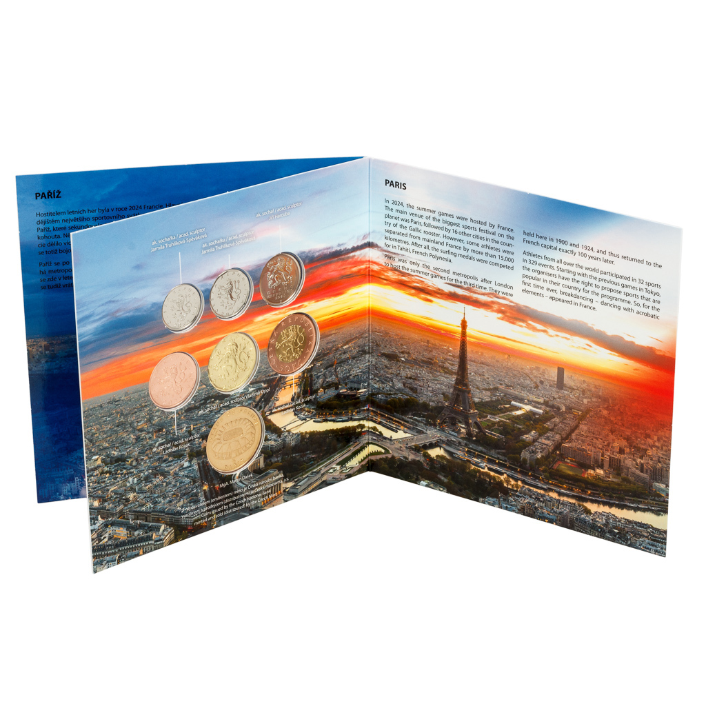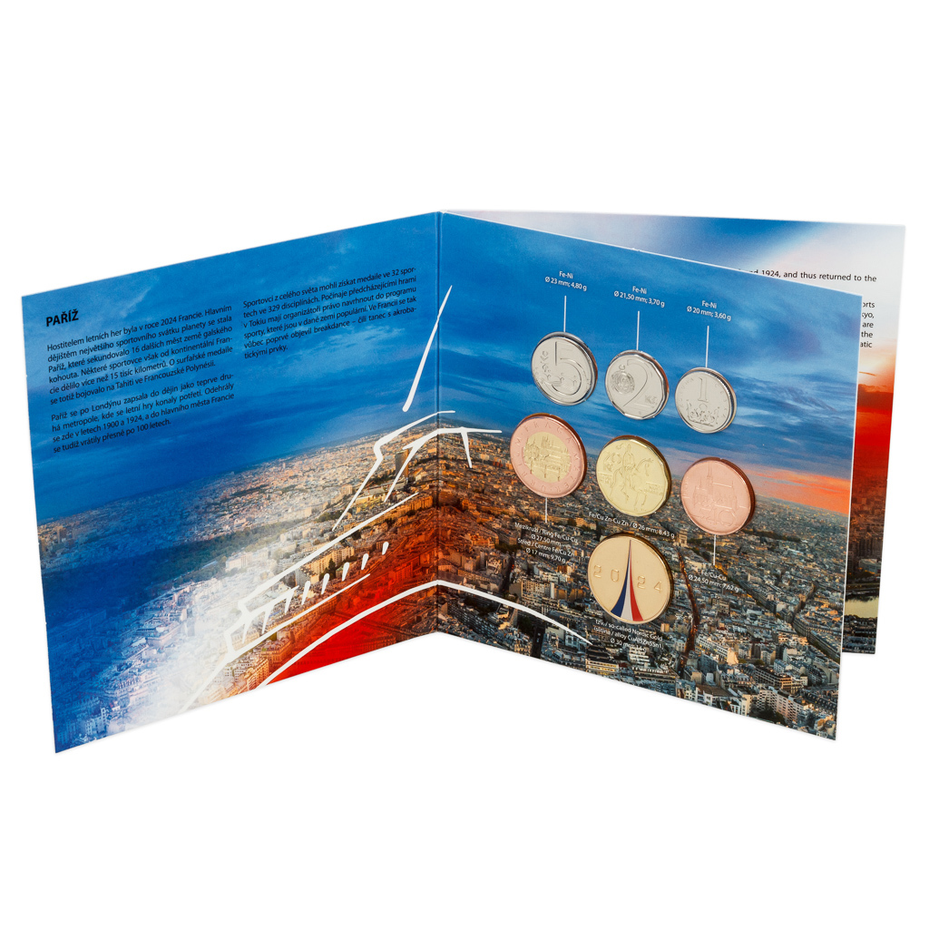 V sadě najdete šest oběžných mincí s nominálními hodnotami 1, 2, 5, 10, 20 a 50 Kč, které byly vyraženy v roce 2024 a neprošly oběhem. Dalším dílem skládanky je speciální pamětní žeton z dílny medailéra MgA. Martina Daška. Kolorovaná ražba nese francouzský národní stadion Stade de France a francouzskou trikoloru, jež svým tvarem evokuje Eiffelovu věž.