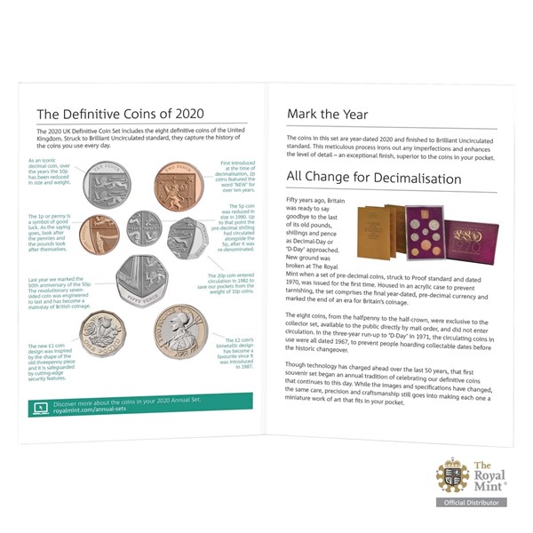 Kombinované reliéfy reverzních stran šesti pencí (50, 20, 10, 5, 2 a 1 p) odhalují majestátní státní znak. Jednolibrová mince nese na reverzu anglickou růži, velšský pór, skotský bodlák a severoirský jetel – rostlinné motivy symbolizující čtyři národy Spojeného království. Reverzu dvoulibrové mince pak vévodí zosobnění Britannie s přilbou, štítem a trojzubcem. Averzní strany ražeb patří portrétu královny Alžběty II. z profilu, roku emise 2020 a zkrácenému latinskému nápisu, který lze přeložit jako „Alžběta II., z Boží milosti královna, ochránkyně víry“.