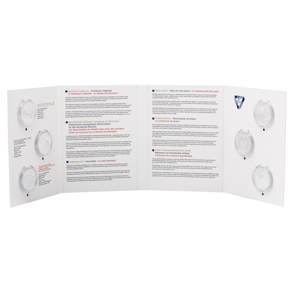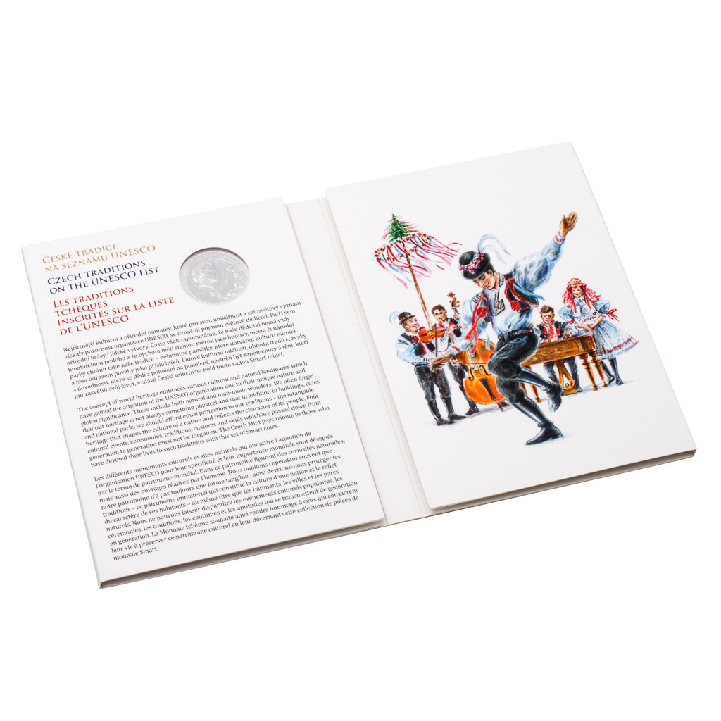 Jednotlivé tradice jsou zvěčněny v ryzím stříbře v podobě půvabných Smart mincí, jejichž výtvarné návrhy pro ražbu kouzelně zpracovala Lenka Nebeská, DiS. Reverz vždy představuje tematický výjev a název tradice, averz je pak společný celé sadě a nese nezbytné atributy emitenta spolu s nominálem a anglickým textem INTANGIBLE CULTURAL HERRITAGE – CZECH REPUBLIC (NEHMOTNÉ KULTURNÍ DĚDICTVÍ UNESCO – ČESKÁ REPUBLIKA). Půvabně řešené album nabízí trojjazyčné texty v češtině, angličtině a francouzštině a nabízí tak originální dárek i krásný umělecký soubor pro Vaše vytříbené sbírky!