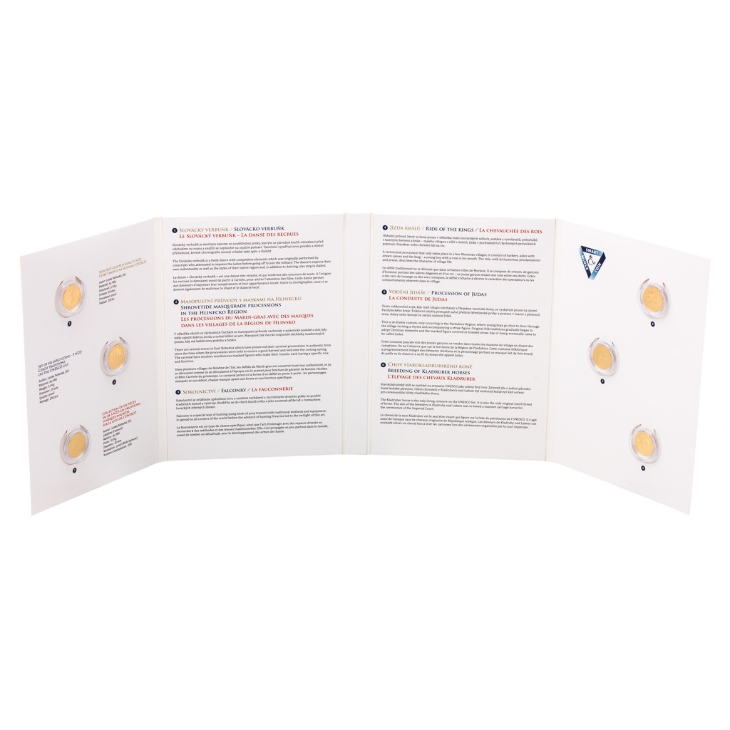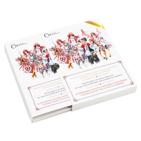 Sada zlatých mincí představuje soubor šesti kouzelných uměleckých děl talentované výtvarnice Lenky Nebeské, DiS. Každá Smart mince nese na reverzu mistrovsky zpracovaný motiv jedné z nehmotných památek UNESCO, který obzvláště vyniká v mimořádné kvalitě proof. Averz, který je společný celé sadě, nese nezbytné atributy emitenta spolu s nominálem a anglickým textem INTANGIBLE CULTURAL HERRITAGE – CZECH REPUBLIC (NEHMOTNÉ KULTURNÍ DĚDICTVÍ UNESCO – ČESKÁ REPUBLIKA). Smart mince jsou uloženy v krásném tematickém albu obsahujícím trojjazyčné informace v češtině, angličtině a francouzštině. Půvabná sběratelská sada se bude vyjímat ve Vašich kolekcích a stejně tak poslouží i jako neobyčejný hodnotný dárek pro mimořádné příležitosti. Emise je limitována pouhými 200 kusy!