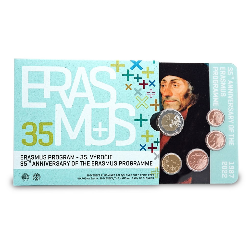 Sada slovenských oběžných mincí s ročníkem 2022 připomíná 35. výročí oblíbeného vzdělávacího programu s názvem Erasmus.