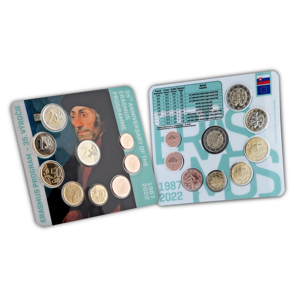 V ucelené sadě najdete všechny platné oběžné euromince, které v roce 2022 vydala Národná banka Slovenska a vyrazila slovenská Mincovňa Kremnica. Jedná se o nominální hodnoty 1, 2, 5, 10, 20 a 50 c a 1 a 2 €, které jsou doplněny pamětní dvoueurovou mincí s motivem programu Erasmus.
