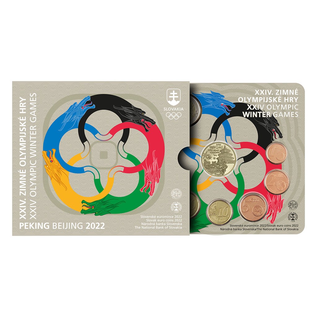 V ucelené sadě najdete všechny platné oběžné euromince, které v roce 2022 vydala Národná banka Slovenska a vyrazila slovenská Mincovňa Kremnica. Jedná se o nominální hodnoty 1, 2, 5, 10, 20 a 50 c a 1 a 2 €, které jsou doplněny tematickým pamětním žetonem. Zatímco averzní strana žetonu je věnována pekingským památkám – Chrámu nebes a zdobeným střechám Zakázaného města –, reverz patří olympijským sportovištím – Ptačímu hnízdu a Národnímu skokanskému centru. Kompozici dotvářejí ještě sněhové vločky, olympijské kruhy a lyžař.