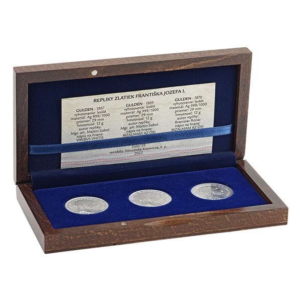 Třídílná sada replik stříbrných guldenů, které vyrazila slovenská Mincovňa Kremnica, připomíná vládu Františka Josefa I.