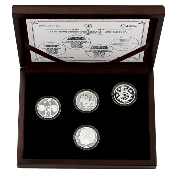 Sada stříbrných replik československých mincí a medaile Jiřího Harcuby proof