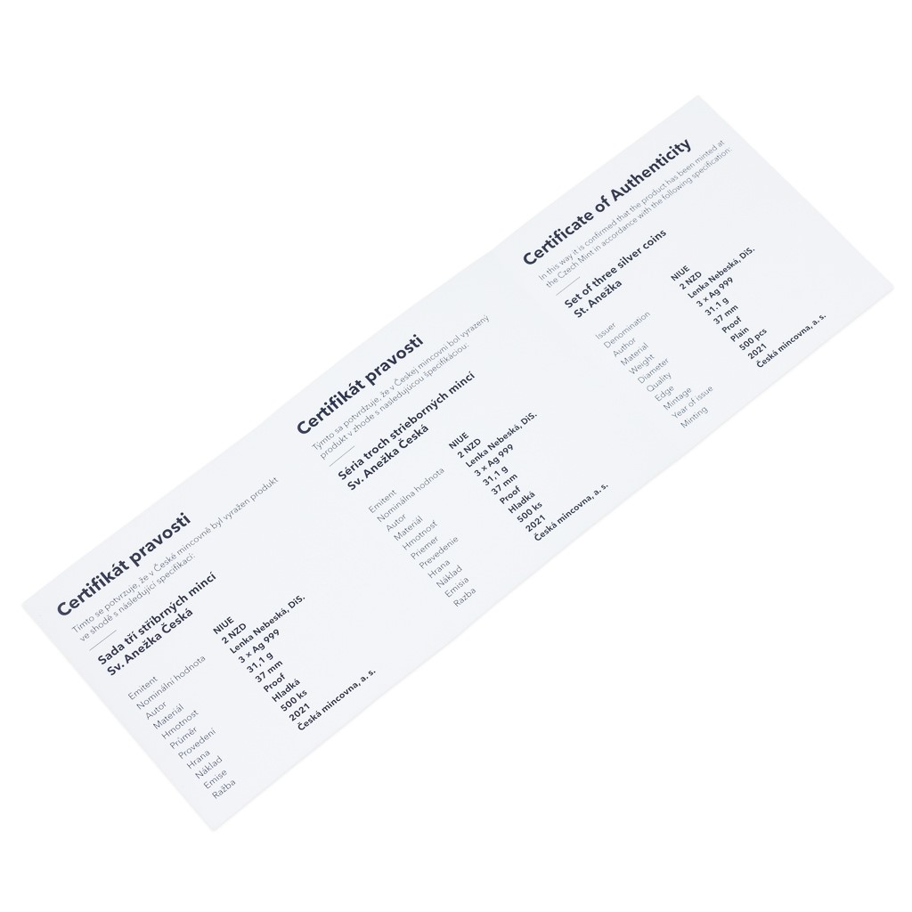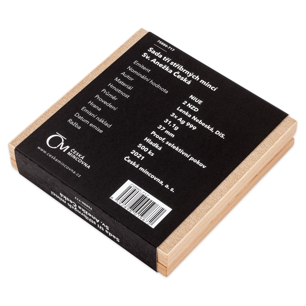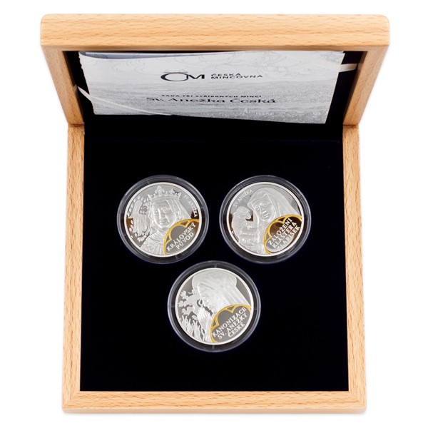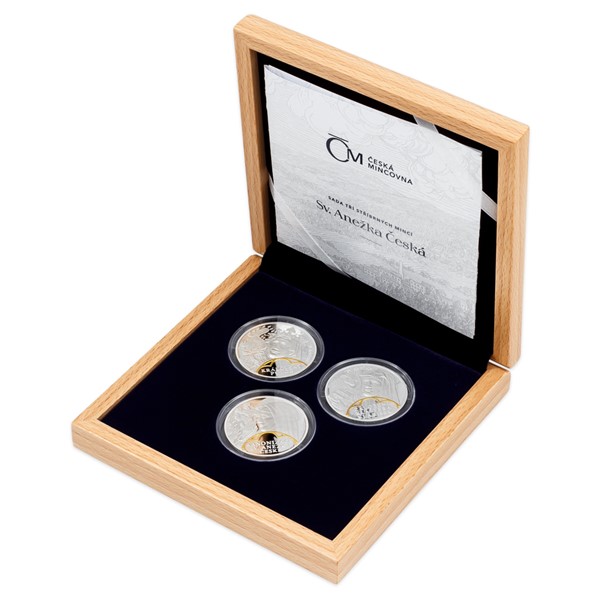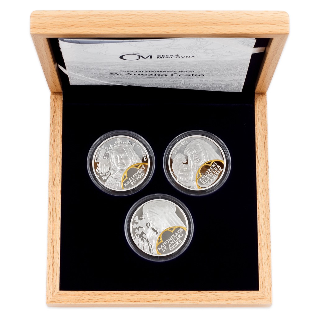 Sady České mincovny složené ze stříbrných ražeb zkrášlených selektivním pozlacením jsou tradičně věnovány náboženským tématům, která jsou nedílnou součástí naší historie. Tato trojice mincí vzdává hold svaté Anežce České.