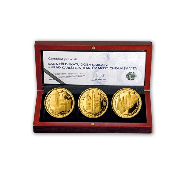Zlatou éru českých dějin nejlépe zrcadlí ryzí zlato. Česká mincovna proto k poctě období vlády otce vlasti připravila mimořádnou emisi zlatých dukátů. Sada Doba Karla IV. je uložena v luxusní dřevěné etuji a doplňuje ji certifikát pravosti. Zlaté dukáty Karlštejn, Karlův most a katedrála sv. Víta jsou zářnou připomínkou národní historie a současně obdivuhodným uměleckým dílem.