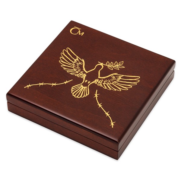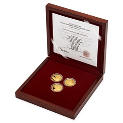 Trojice mincí je uložena do luxusní dřevěné krabičky ozdobené tematickou rytinou.