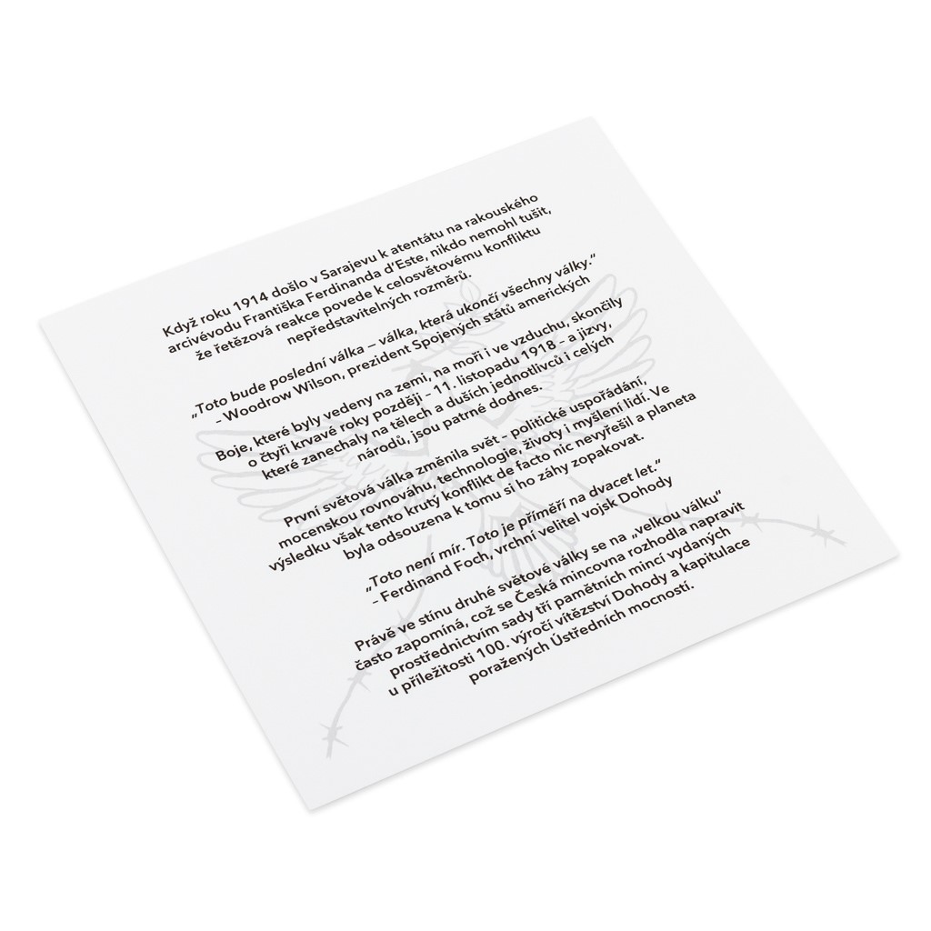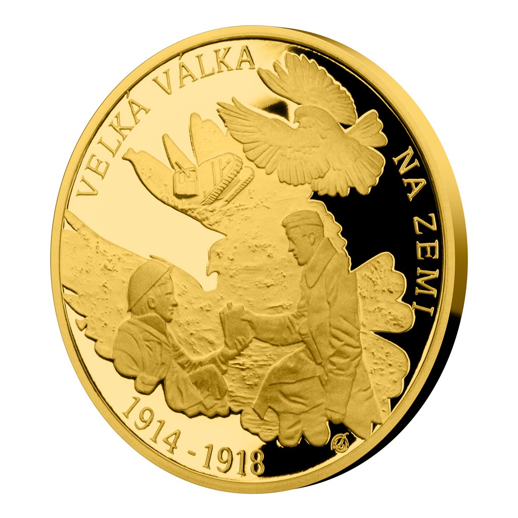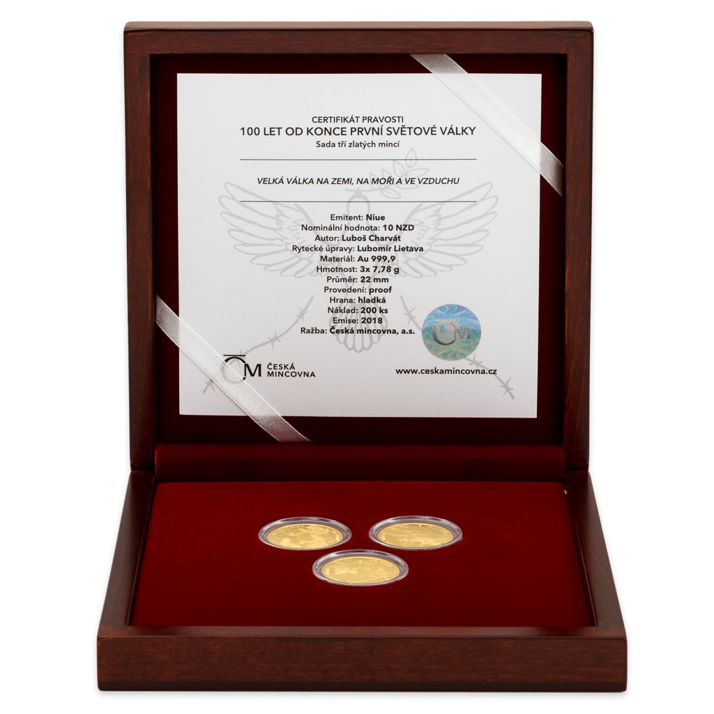 První světová válka byla konfliktem, jaký lidstvo do té doby nepoznalo. Výstřely kulometů a děl utichly před rovnými 100 lety a u příležitosti tohoto výročí vychází sada tří zlatých pamětních mincí České mincovny, která oslavuje konec „velké války“ na zemi, na moři a ve vzduchu.