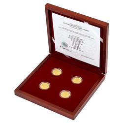 Trojice mincí je uložena do luxusní dřevěné krabičky.