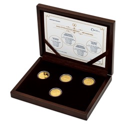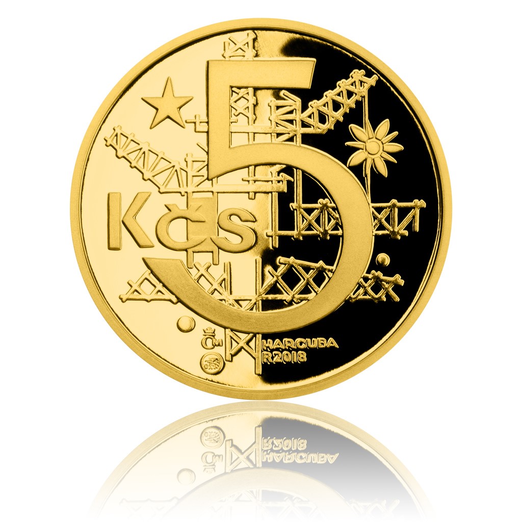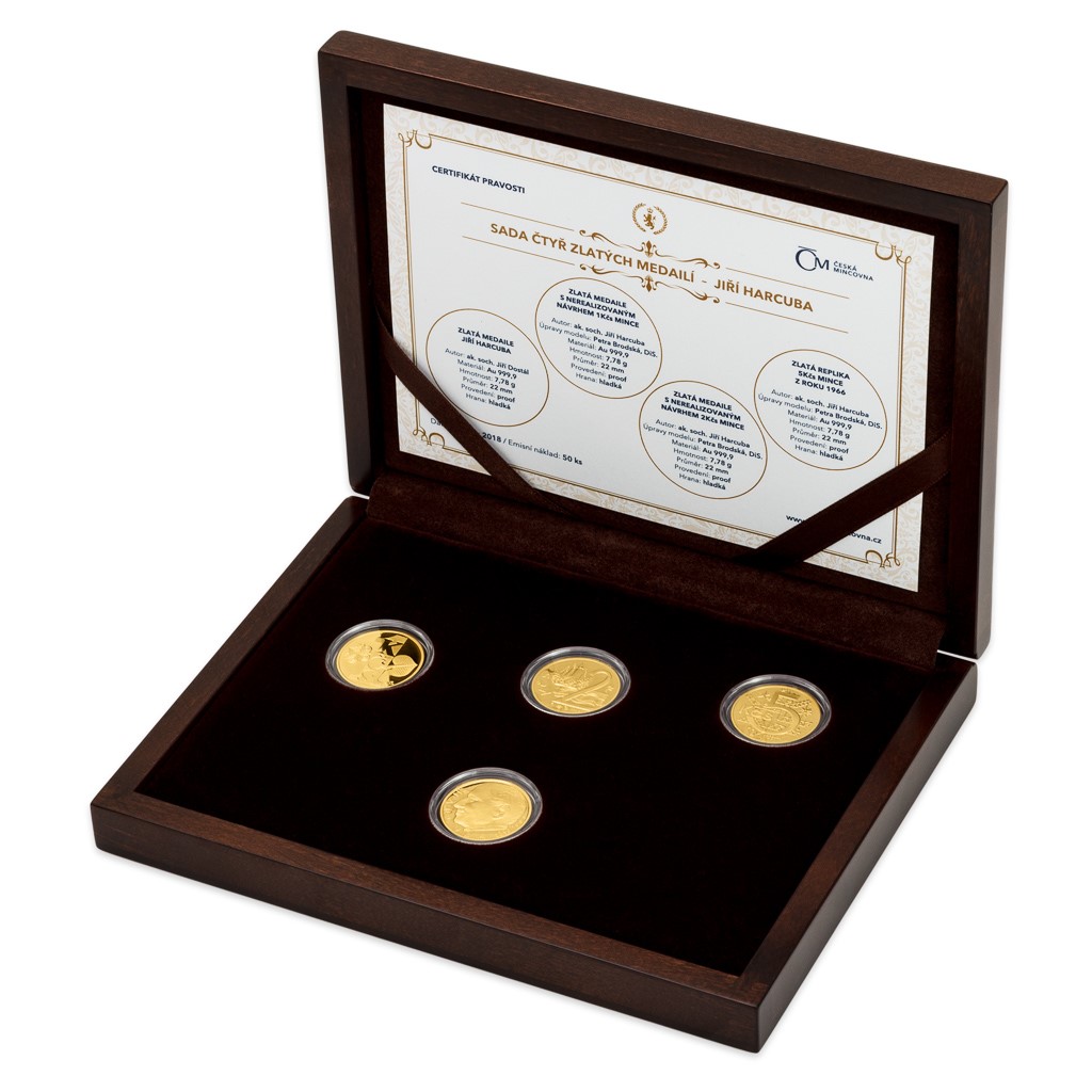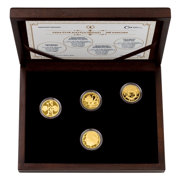 Sada zlatých replik československých mincí a medaile Jiřího Harcuby proof