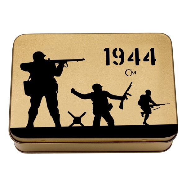Čtveřici příběhů, které se v roce 2019 objevují na zlatých mincích České mincovny z minisérie Válečný rok 1944, si můžete tradičně uložit do této stylové sběratelské etue. Je vyrobena z plechu – stejně jako většina boxů používaných za druhé světové války. Do kovových pouzder se před nástupem éry plastů ukládalo v armádě téměř vše – od lékárniček po kulometné nábojové pásy.