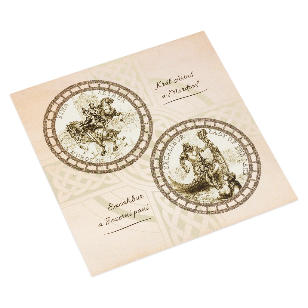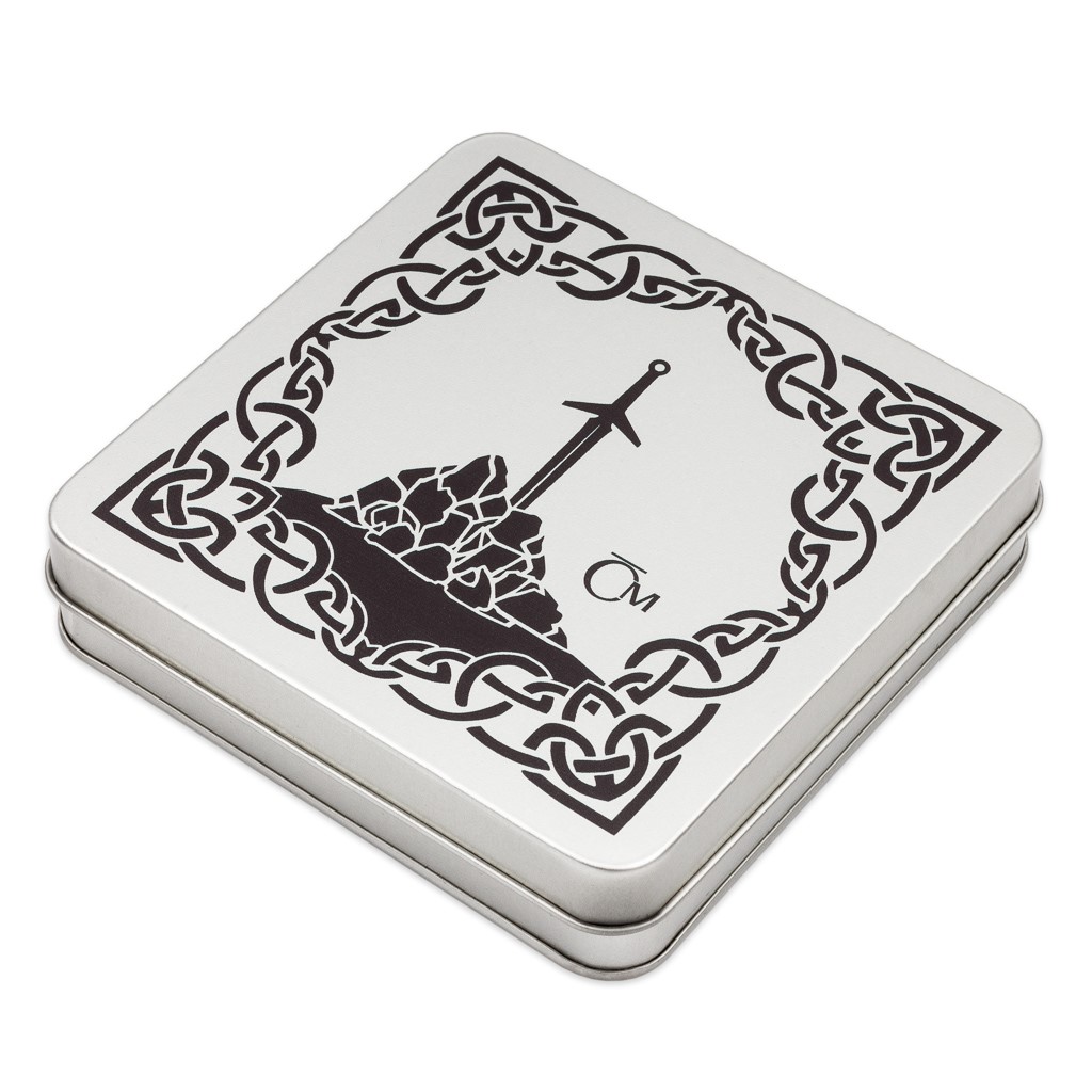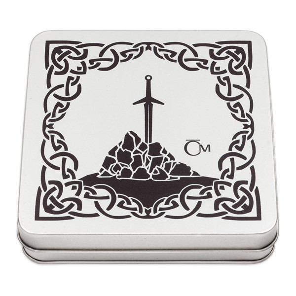 Sbírku čtyř mincí si můžete uložit do této plechové sběratelské etue. Její víčko zdobí tematická ilustrace, která připomíná pověst o Artušově první zbrani – meči, který byl uvězněn v kameni a který mohl vytáhnout jen právoplatný král… Nedílnou součástí krabičky je příloha s kresbami Asamata Baltaeva, DiS. – autora mincí.