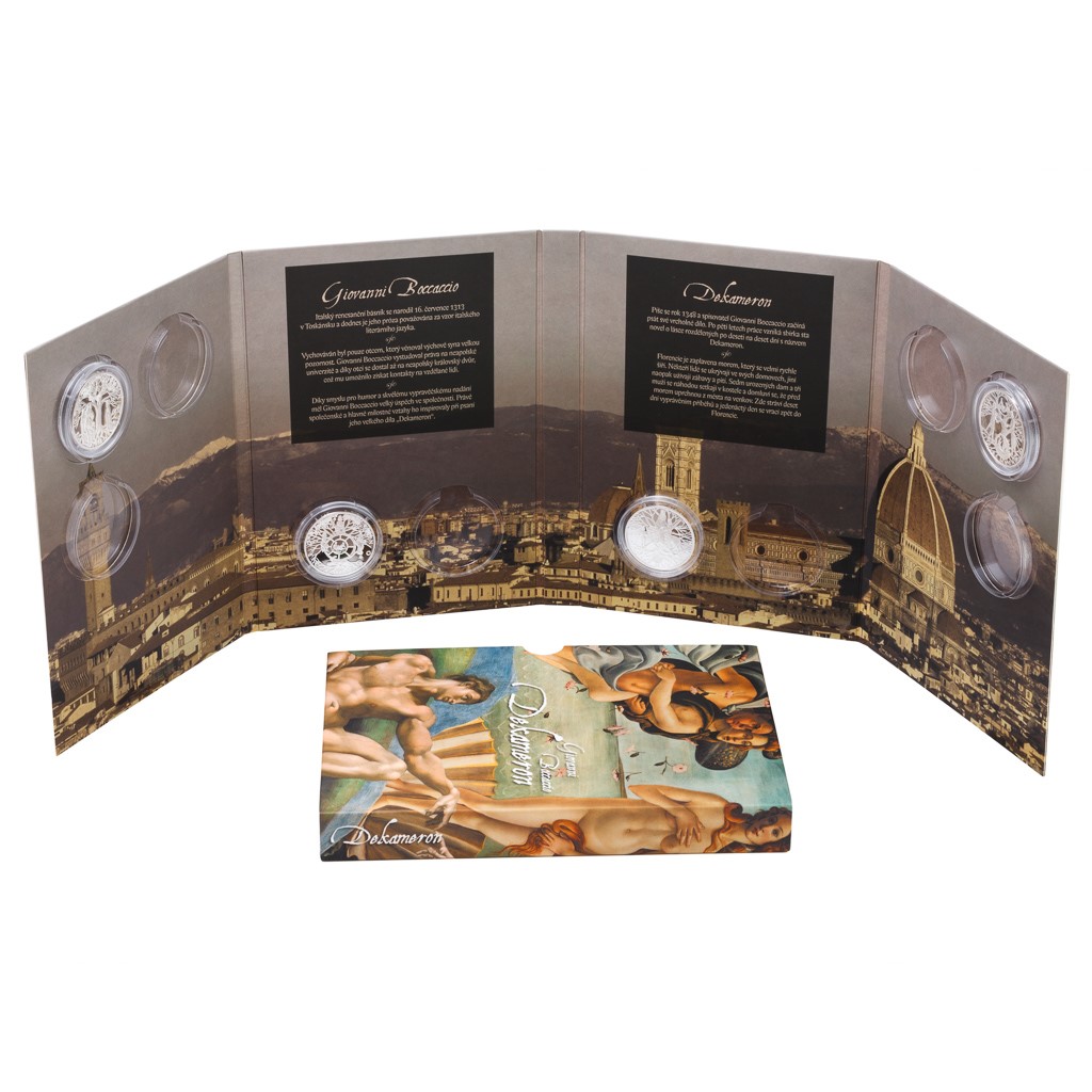 Dekameron - to je sto půvabných příběhů o lásce vyprávěných mistrovským jazykem zakladatele italské renesanční prózy Giovanniho Boccaccia. Právě při příležitosti 700. výročí jeho narození roku 2013 připravila Česká mincovna mimořádnou sérii stříbrných medailí.