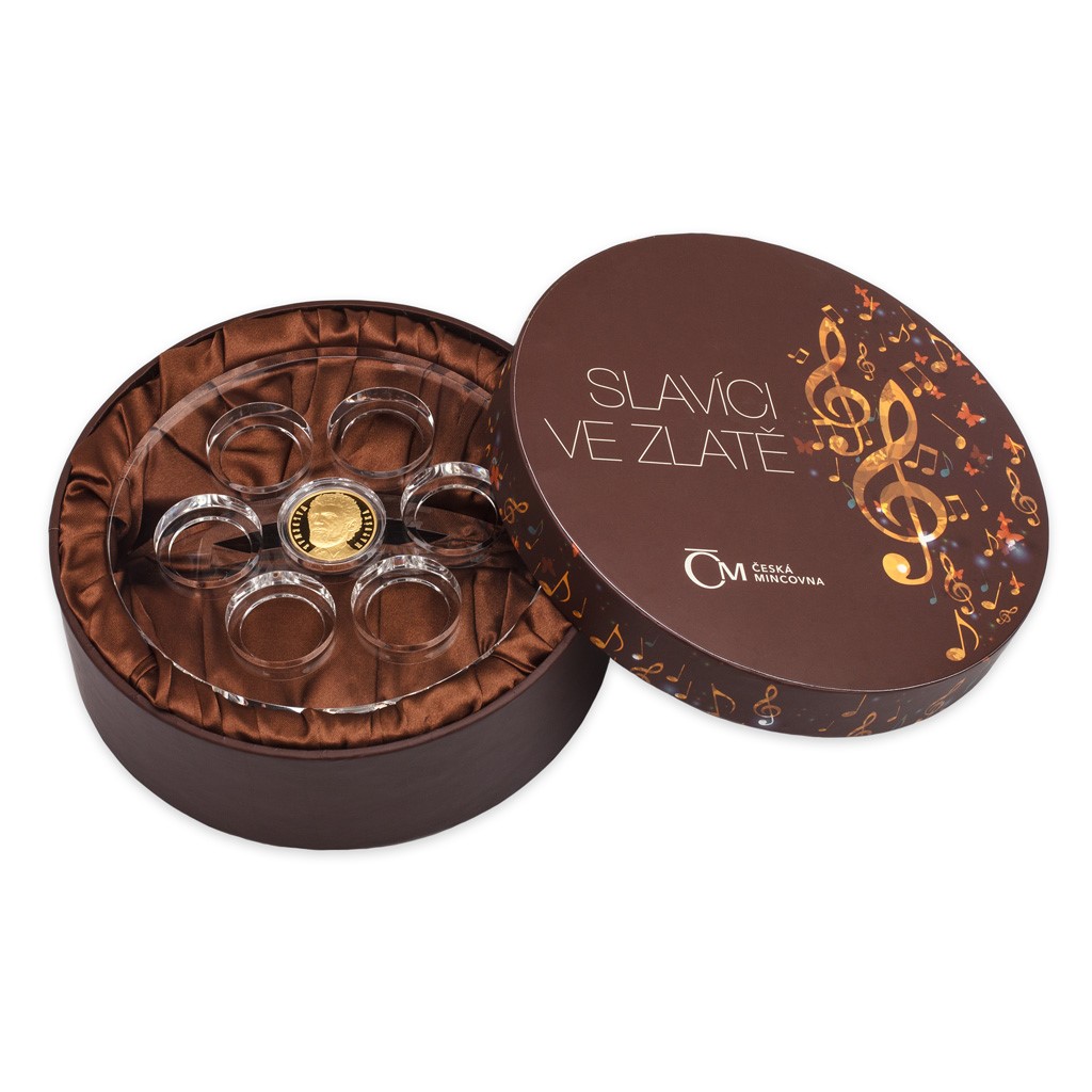 Sedm úžasných umělců, sedm numismatických klenotů se bude vyjímat ve stylovém kulatém boxu v hnědé barvě vkusně zdobeném decentními hudebními motivy. Uchovejte své poklady i finanční rezervy elegantně a bezpečně!