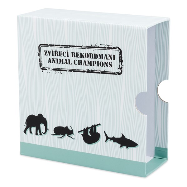 Každá mince se zvířecím rekordmanem je uložena do speciálního balení v podobě knížky. Druhou čtveřici si můžete uložit do tohoto praktického boxu.