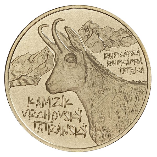 Třetí emise z cyklu pamětních euromincí, který je věnovaný slovenské fauně a flóře, připomíná kamzíka horského tatranského.