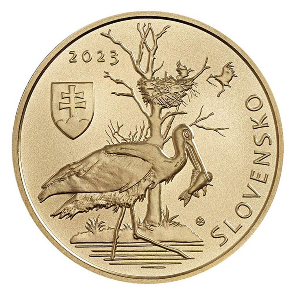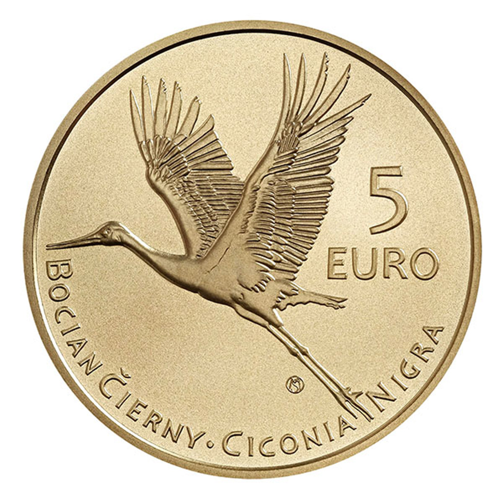 Další emise z cyklu pamětních euromincí, který je věnovaný slovenské fauně a flóře, připomíná čápa černého.