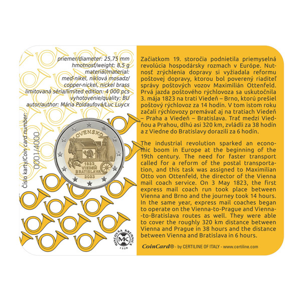 V roce 2023 uplynulo 200 let od spuštění pravidelné expresní pošty na trase Vídeň–Bratislava. Toto výročí připomíná slovenská pamětní mince zasazená do sběratelské karty.